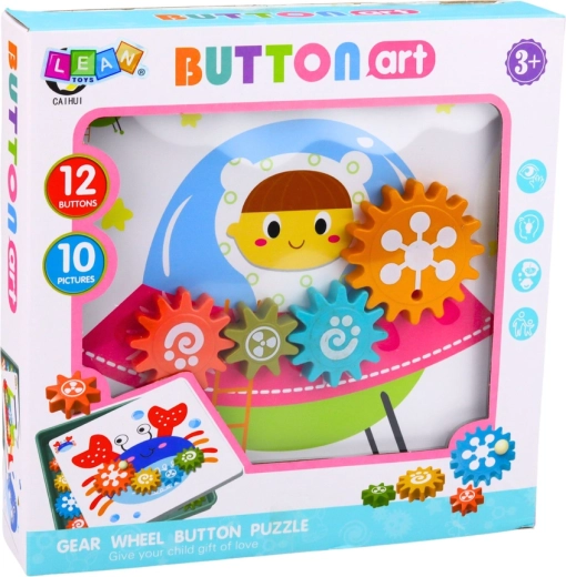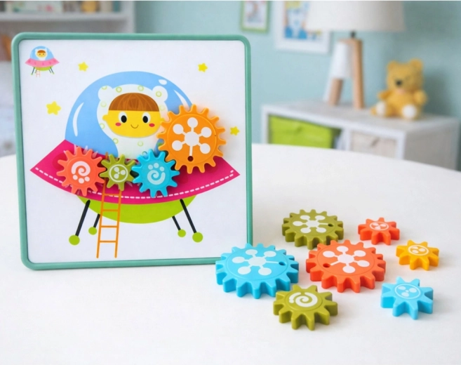 Ta pomysłowa układanka łączy zabawę i naukę. Dzieci umieszczają kolorowe koła zębate w wycięciach na tematycznych kartach i obserwują, jak po prawidłowym połączeniu wszystkie koła obracają się wspólnie. W prosty i przystępny sposób poznają podstawy przekładni oraz zasadę współpracy poszczególnych elementów.