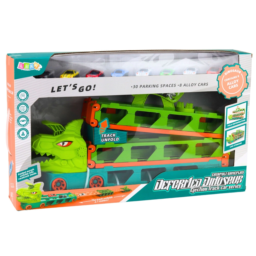 Zestaw pełen zabawy dla małych kierowców i miłośników dinozaurów: ciężarówka dinozaur, która zmienia się w tor wyścigowy o długości 2,1 m, oferuje funkcje 4w1 – transporter, tor wyścigowy, garaż i wyrzutnia. W zestawie znajduje się 8 metalowych autek, jednoczesny start dwóch pojazdów z głowy T-Rexa oraz praktyczny uchwyt do przenoszenia – do zabawy w domu i w podróży.