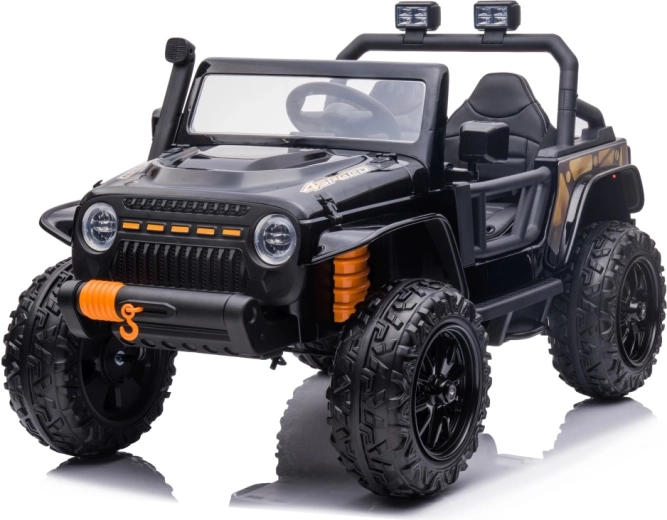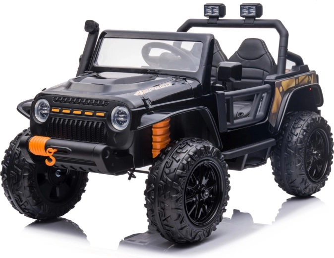 Bezpieczeństwo przede wszystkim: pilot 2,4 GHz pozwala rodzicom przejąć kontrolę w każdej chwili, w tym użyć przycisku bezpieczeństwa Stop. Dwuosobowe siedzisko z eko skóry z pasami bezpieczeństwa oraz otwierane drzwi gwarantują wygodę i łatwe wsiadanie. Przednie światła LED oraz lampy na górnej ramie dodają realistycznego wyglądu i poprawiają widoczność.