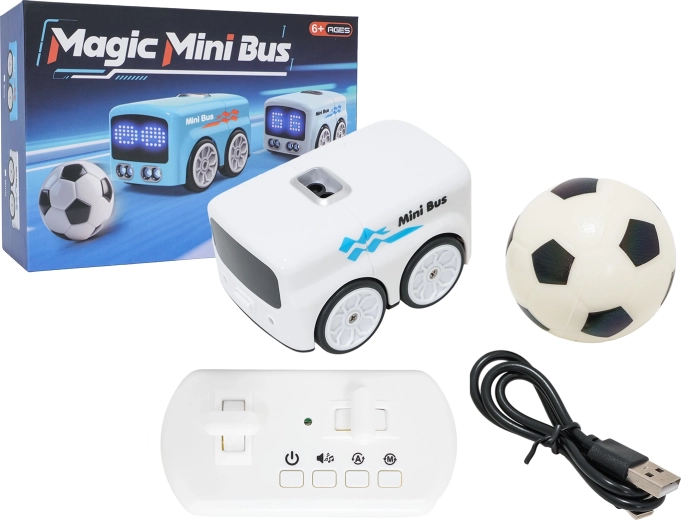 Odkryj sprytny mini autobus RC, który potrafi znacznie więcej niż tylko jeździć do przodu i do tyłu. Dzięki czujnikom rozpoznaje przeszkody i sam je omija, umie śledzić ruch dłoni oraz dołączoną piłkę, a także zachwyca animacjami LED uroczych min i serduszek. Sterowanie jest proste – za pomocą wygodnego pilota lub gestów.