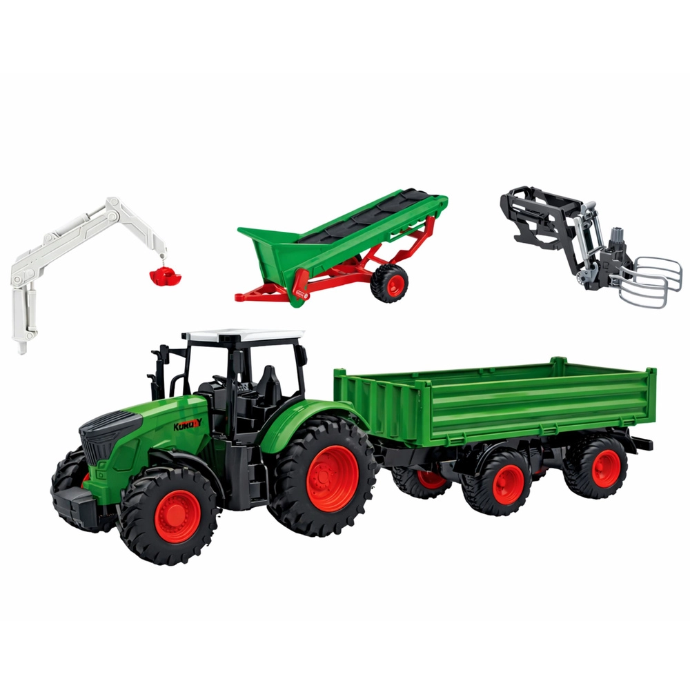 W zestawie znajdują się traktor z hakiem holowniczym, przyczepa, przenośnik, zagrody z bramami, figurki farmerów i zwierząt oraz szereg narzędzi i akcesoriów. Zabawa rozwija małą motorykę, wyobraźnię oraz umiejętności odgrywania ról.