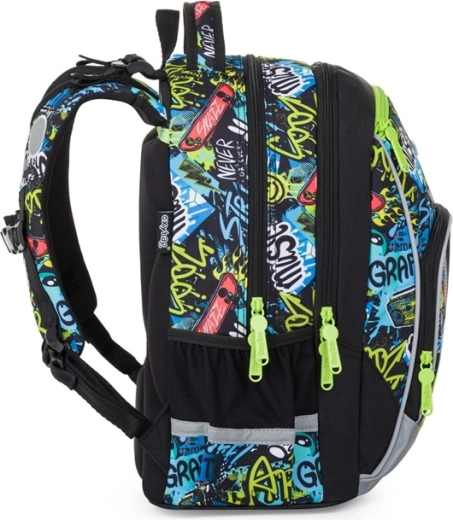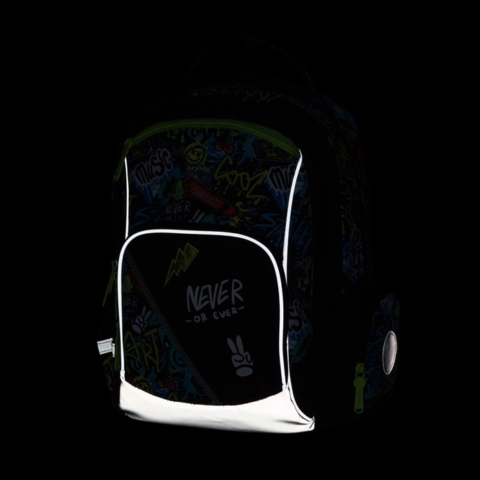 Plecak szkolny Oxybag OXY GO Funny Boy w nowoczesnym stylu graffiti został zaprojektowany dla dzieci od ok. 125 cm wzrostu (klasy 1–3). Dzięki anatomicznie profilowanym, oddychającym plecom i regulowanym szelkom zapewnia całodzienny komfort oraz prawidłowe podparcie pleców. Solidne, wodoodporne dno gwarantuje odporność na wodę i zabrudzenia, dzięki czemu zawartość pozostaje bezpieczna.