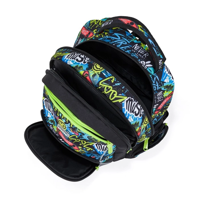 Dwie główne komory, boczna kieszeń na butelkę i zamykana kieszeń na zamek, a także szereg mniejszych kieszonek dla łatwego porządku w szkolnych akcesoriach.