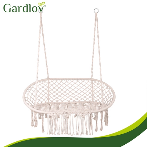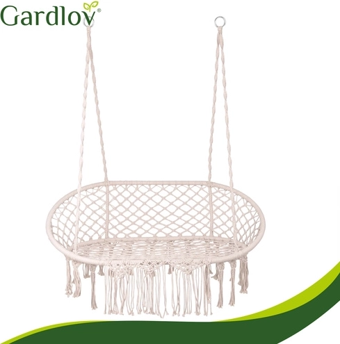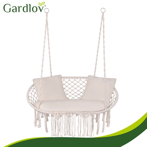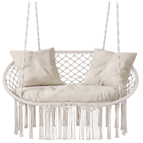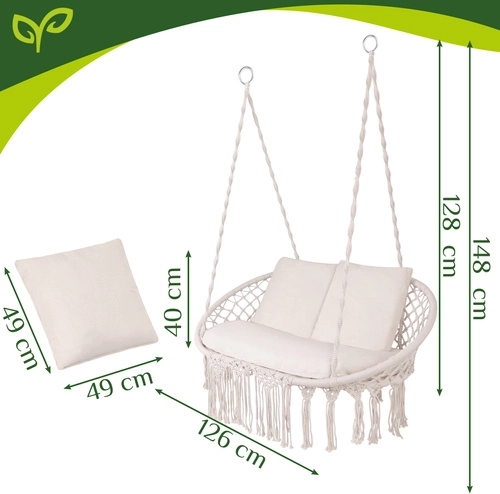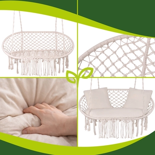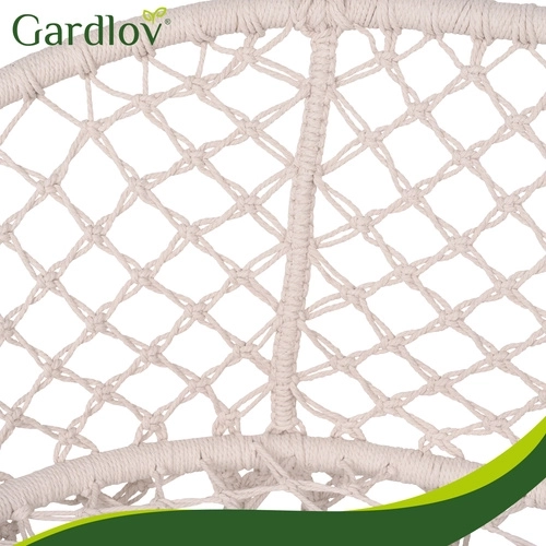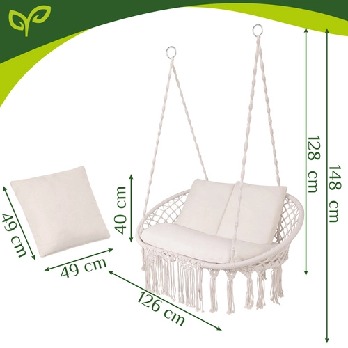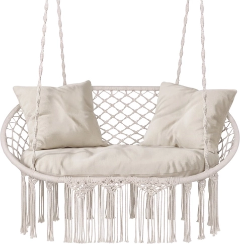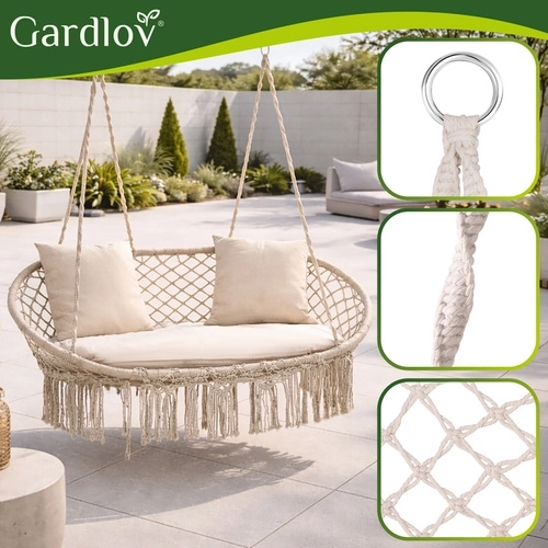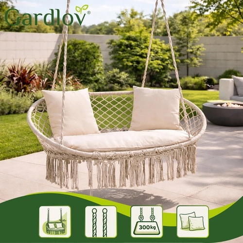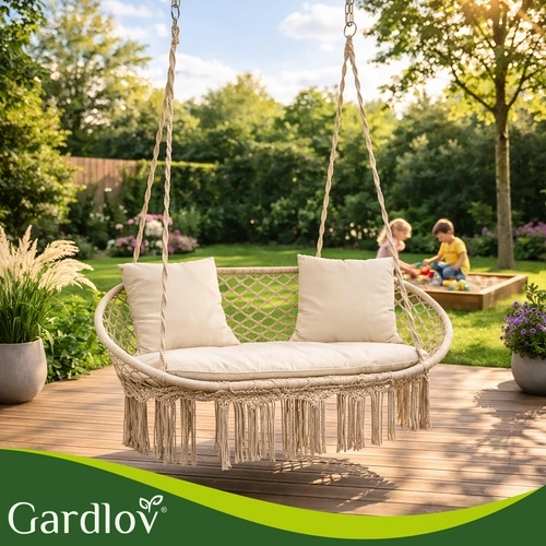 Ciesz się doskonałym odpoczynkiem w ogrodzie, na tarasie i balkonie. Dwuosobowa huśtawka typu bocianie gniazdo GARDLOV oferuje przestronne siedzisko, udźwig do 300 kg oraz 3 miękkie poduszki dla maksymalnego komfortu. Dzięki solidnej metalowej konstrukcji i wytrzymałym linom z metalowymi oczkami zawieszenie jest stabilne i bezpieczne. Kremowe wykończenie w stylu boho pięknie dopełni każdy wystrój na zewnątrz i wewnątrz.