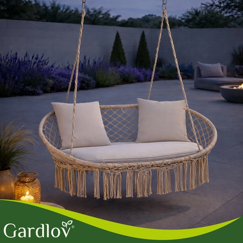 Szukasz wygodnego i stylowego miejsca na relaks we dwoje? Dwuosobowe bocianie gniazdo GARDLOV zamieni Twój taras, balkon i salon w przytulną strefę spokoju. Szerokie siedzisko z miękkim pikowaniem przyjemnie otula ciało i wspiera komfort w pozycji siedzącej i półleżącej. Wytrzymała metalowa konstrukcja opleciona materiałem oraz cztery solidne liny z metalowymi kółkami zapewniają stabilność, bezpieczeństwo i długą żywotność.