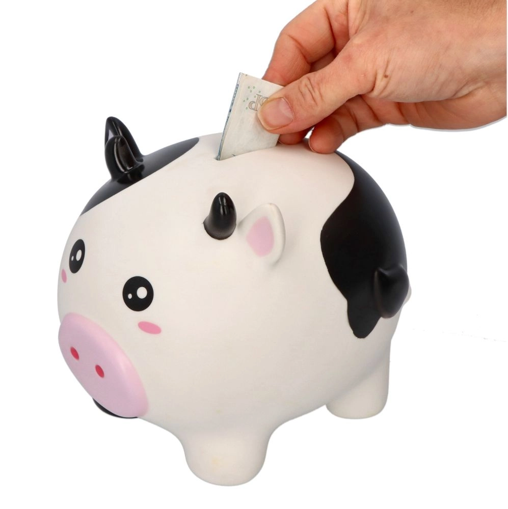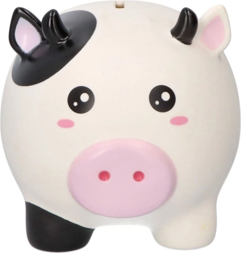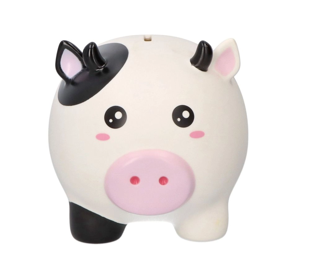 Krówka w czarno-białe łaty z różowym pyszczkiem zamienia oszczędzanie w zabawę – idealna do pokoju dziecięcego i jako pomysł na prezent.