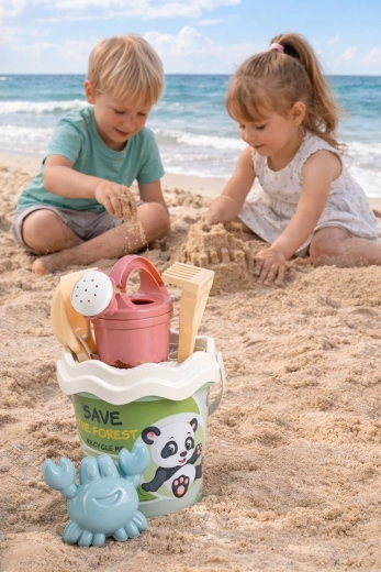 Wiaderko, konewka 0,5 l, sitko, łopatka, grabki i foremka krab – wszystko, czego dzieci potrzebują do budowania zamków, przesiewania i podlewania.