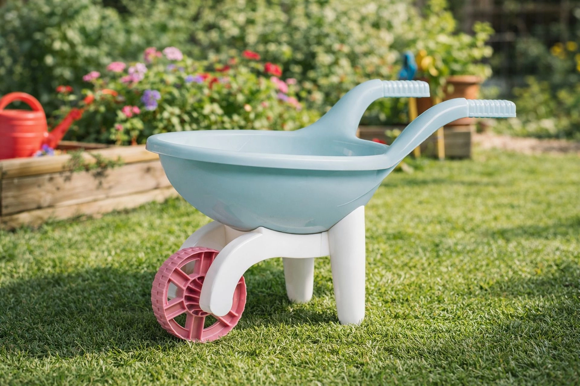 Odkryj zabawę w ogrodzie i na placu zabaw z dziecięcą taczką z recyklingowanego plastiku w łagodnych pastelowych odcieniach. Dzięki stabilnemu, trójpunktowemu rozwiązaniu i szerokiemu kołu przenoszenie piasku, zabawek czy liści jest dla dzieci łatwe i bezpieczne. Lekka konstrukcja i wysoka jakość wykonania zapewniają długą żywotność oraz wygodne prowadzenie.