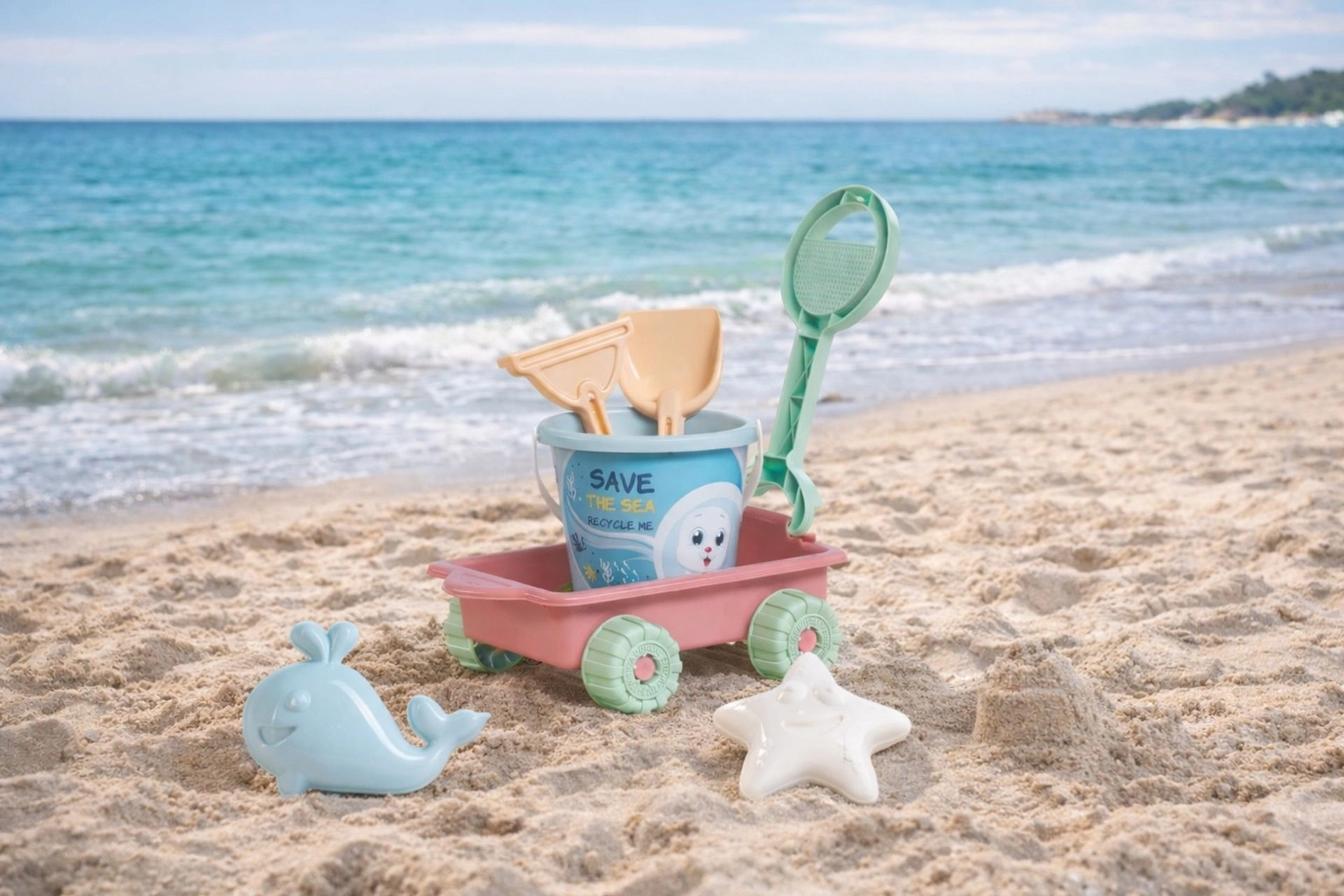 Wiaderko, łopatka, grabki oraz dwie foremki (rybka i rozgwiazda) rozwijają wyobraźnię i małą motorykę. Całość utrzymana w pięknych pastelowych kolorach.