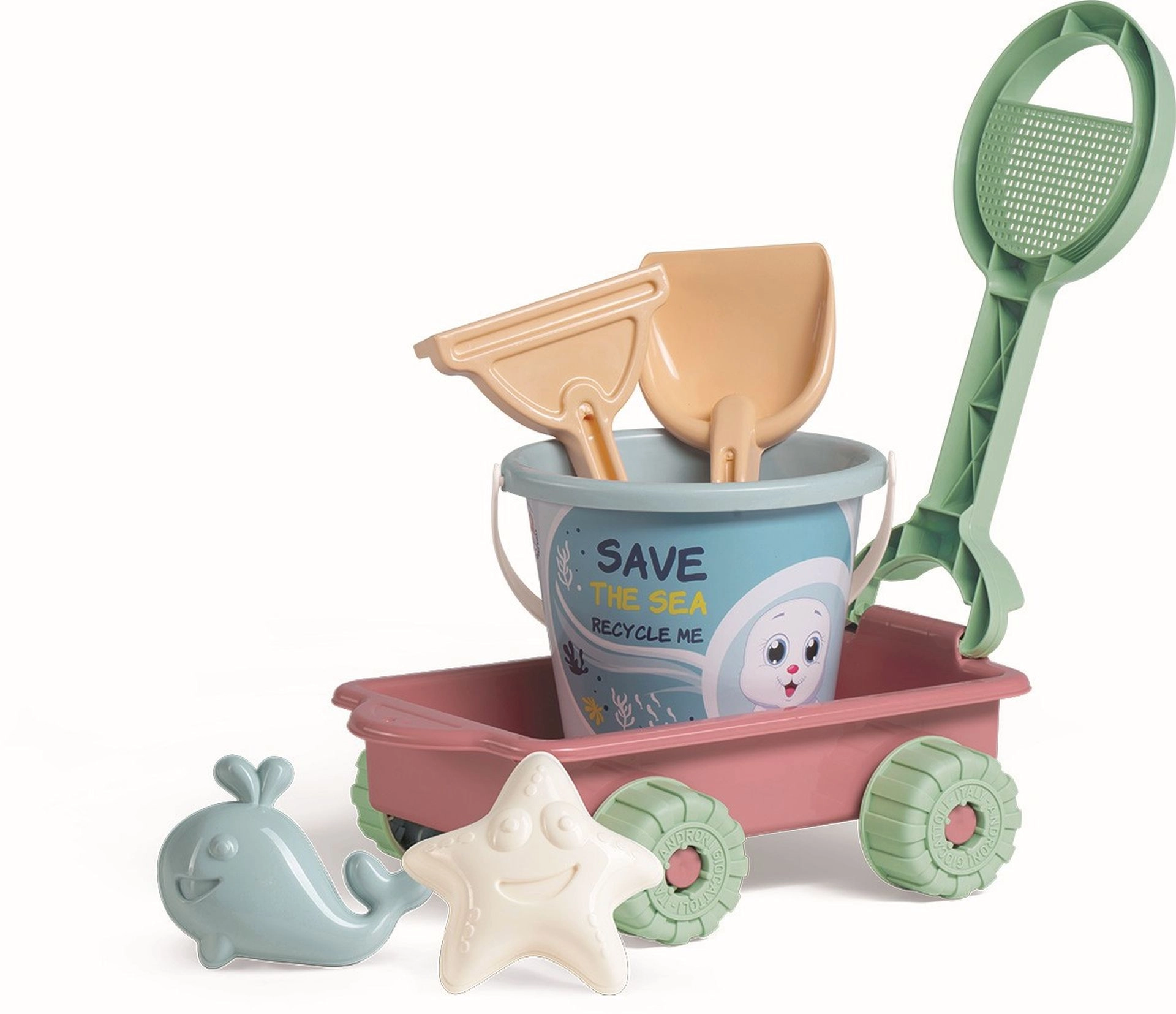 Ciesz się zabawą na plaży i na placu zabaw z tym pastelowym zestawem do piasku z wózkiem. Zawiera 6 elementów z wysokiej jakości plastiku wyprodukowanego we Włoszech: wózek z zdejmowanym sitkiem w uchwycie, wiaderko, łopatkę, grabki oraz foremki rybka i rozgwiazda. Idealny dla małych odkrywców od 10 miesięcy.