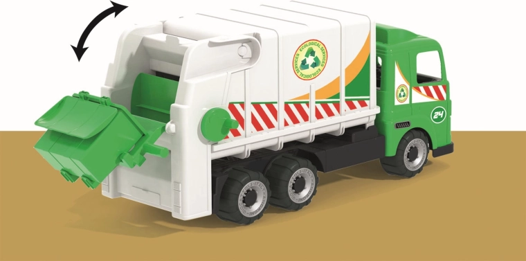Detalicza kabina, nadruki recyklingowe i tylna sekcja kompakująca umożliwiają dzieciom przeżycie autentycznego wywozu odpadów i rozwijanie wyobraźni.