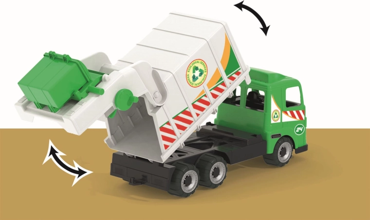 Auto jest częścią serii Heavy Trucks i wyróżnia się trwałą konstrukcją z wysokiej jakości tworzyw produkowanych we Włoszech. Jest bezpieczne i dostosowane do najmłodszych dzieci od 12 miesięcy, wspiera małą motorykę, koordynację ręka–oko oraz zabawy w role związane ze sprzątaniem i recyklingiem.