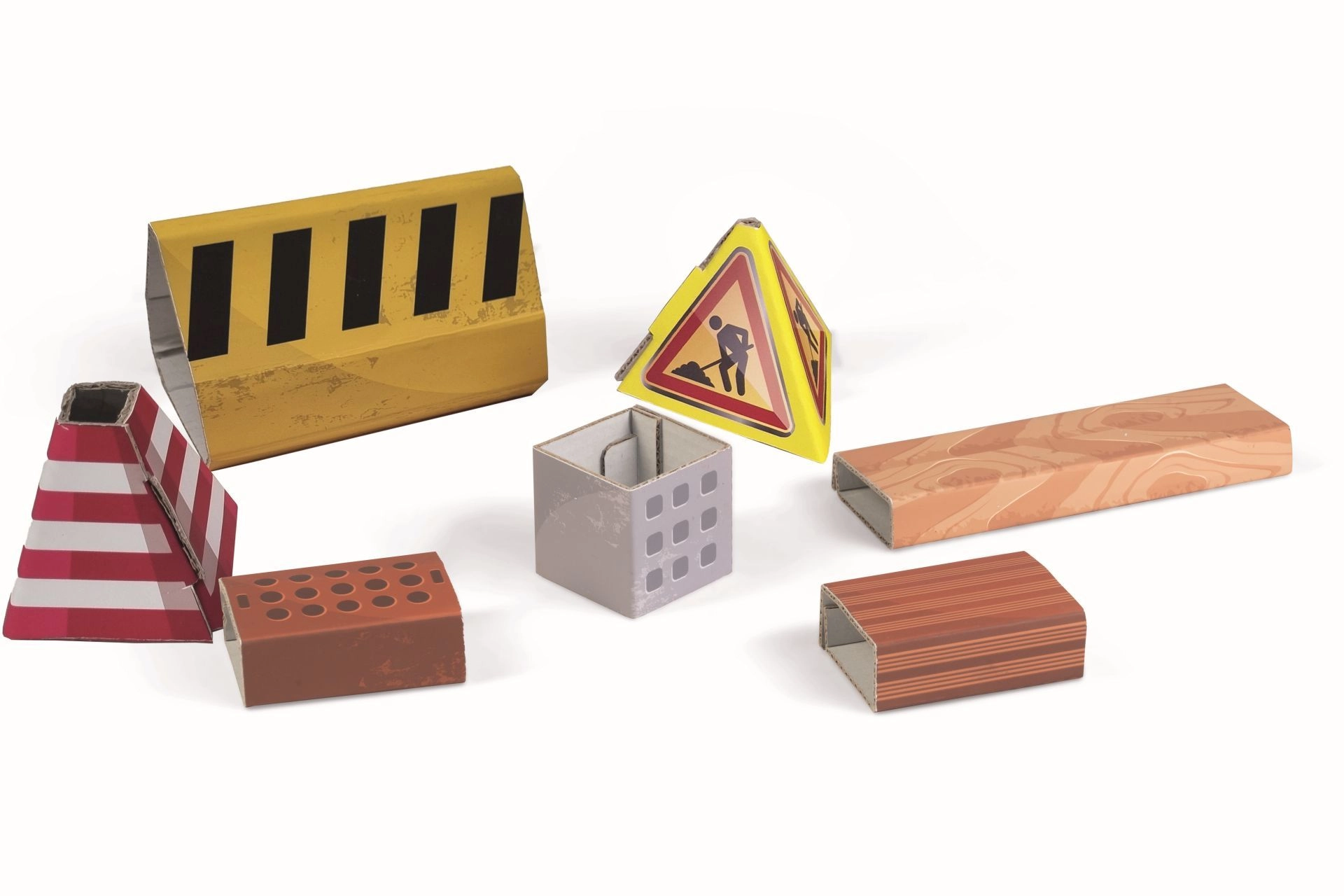 - Kartonowe akcesoria – cegiełki i bariery do scenek z placu budowy.