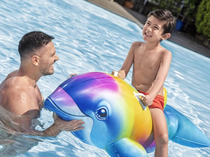Wielokolorowe wykonanie w kształcie delfina zachwyci dzieci i wesprze aktywną zabawę w wodzie. Pływak nadaje się do basenów, jezior i spokojnego morza, a dzięki lekkiej konstrukcji jest łatwy w przenoszeniu i przechowywaniu. Szybkie pompowanie i spuszczanie powietrza docenisz przy każdym wypadzie nad wodę.