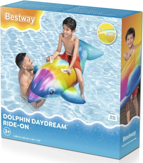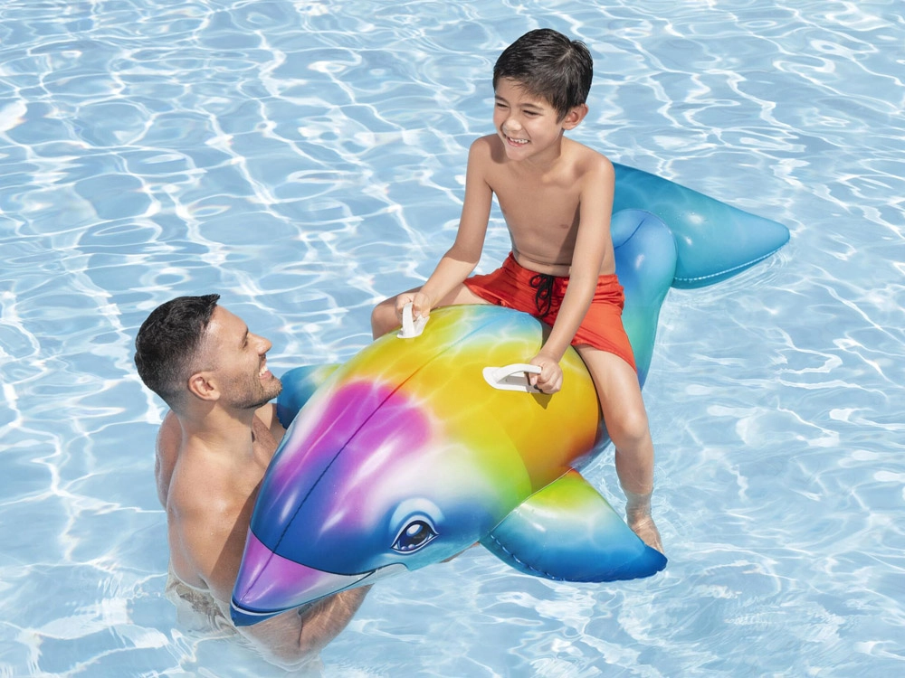 Duży delfin z wielokolorowym efektem doskonale sprawdzi się w basenie, jeziorze i na spokojnym morzu – zachęca do zabawy i relaksu.