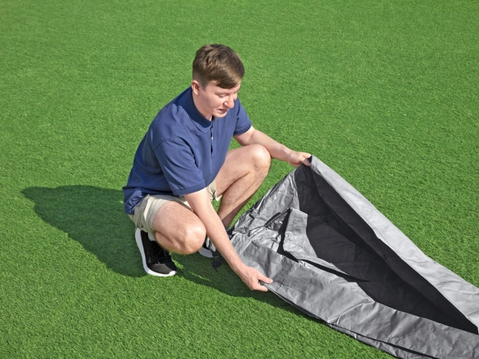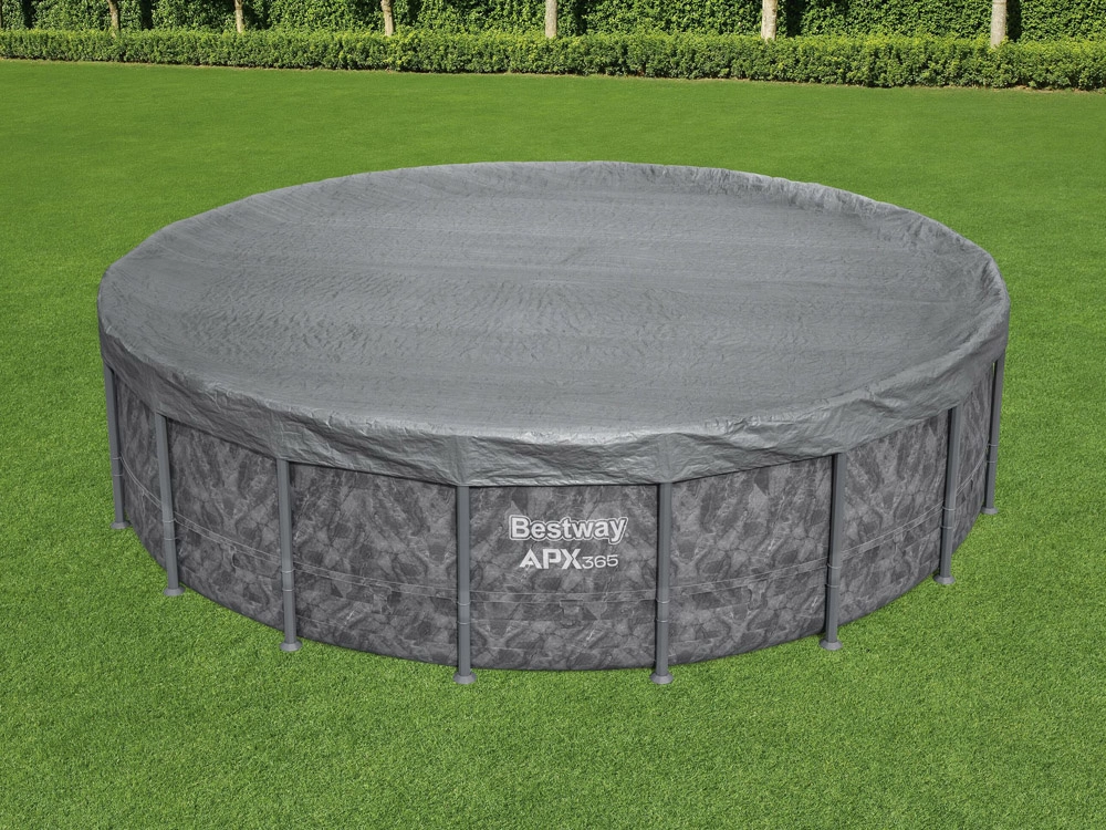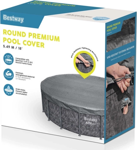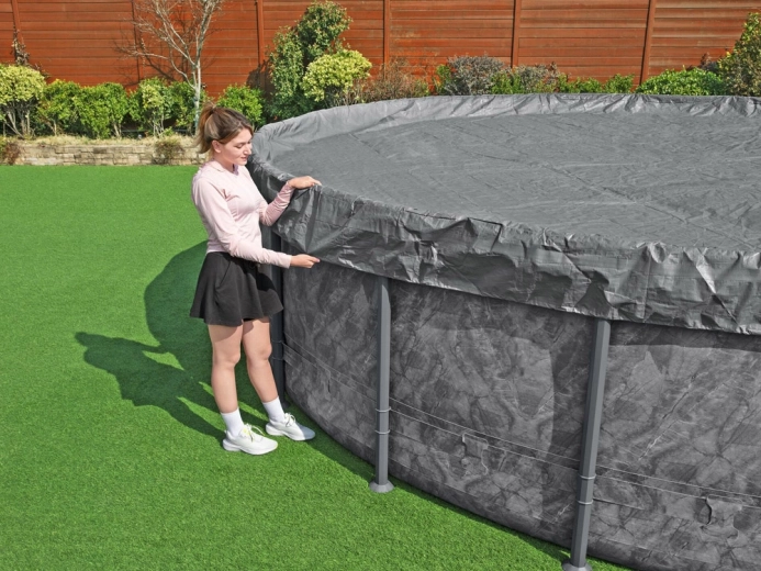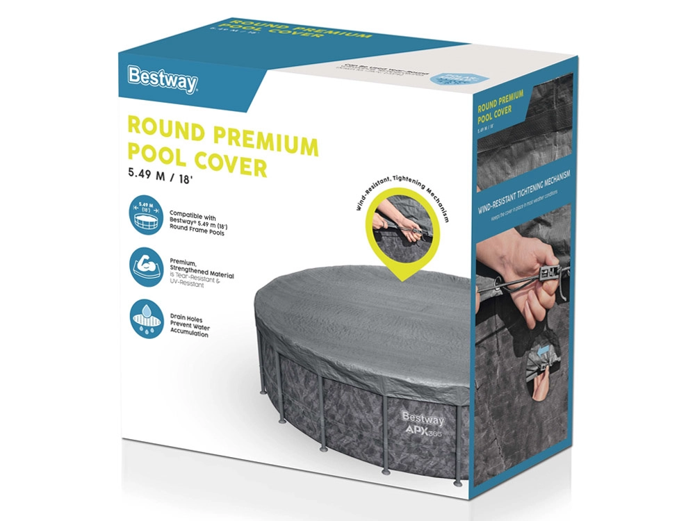 Wysokiej jakości plandeka przykrywająca BESTWAY do okrągłych basenów o średnicy 5,49 m została zaprojektowana do całosezonowego użytkowania. Wzmocniony materiał z ochroną przed promieniowaniem UV jest odporny na rozdarcia i warunki atmosferyczne, a wykończenie powierzchni Polar‑Shield pomaga zachować właściwości także w niskich temperaturach.