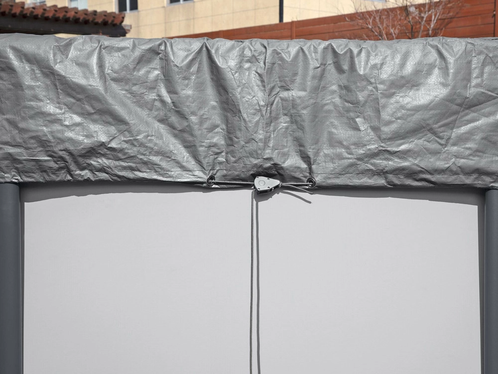 Praktyczne otwory drenażowe odprowadzają wodę deszczową, więc na plandece nie tworzą się ciężkie kałuże. Wiatroodporny system mocowania utrzymuje plandekę mocno na miejscu i zapewnia niezawodne przyleganie do rantu basenu.