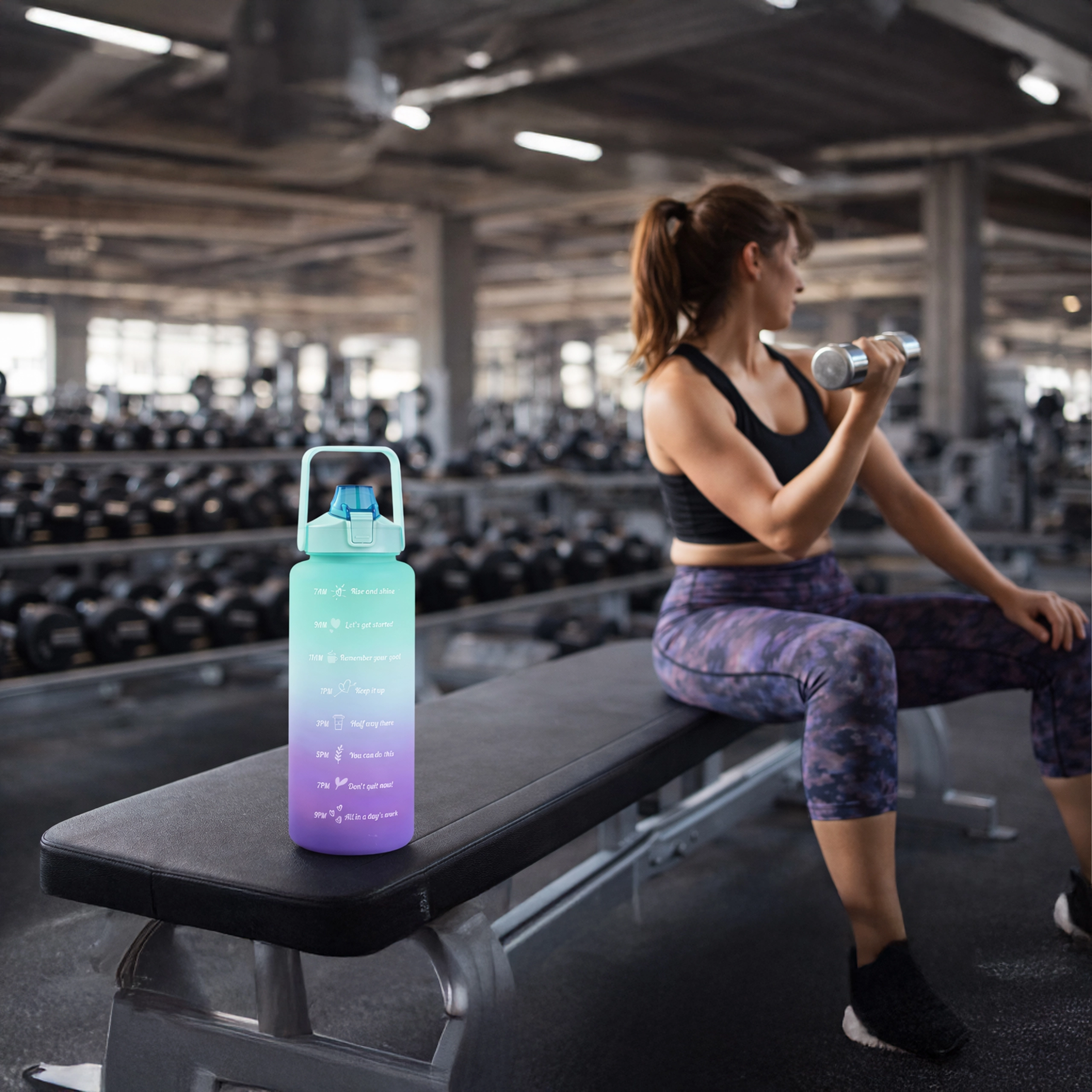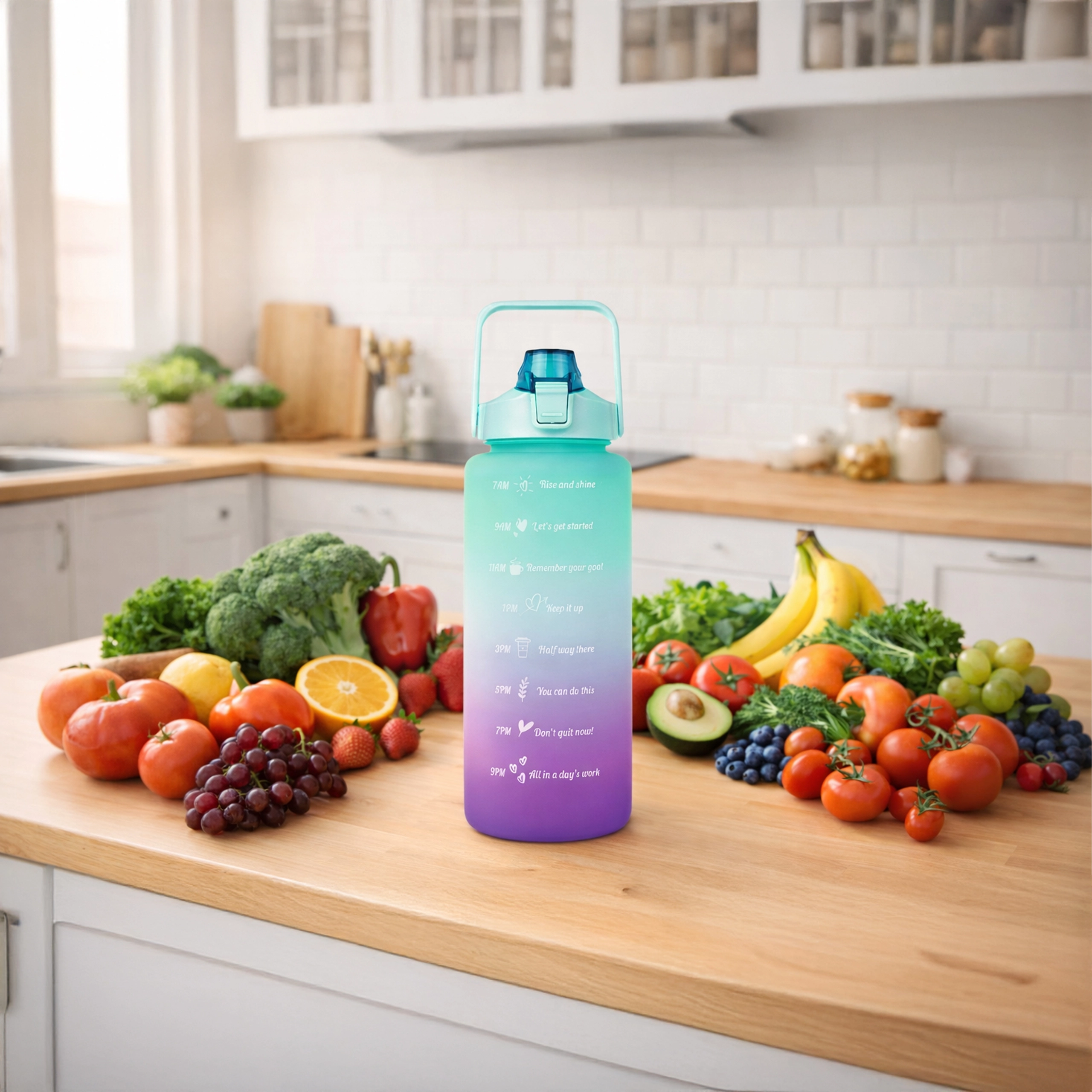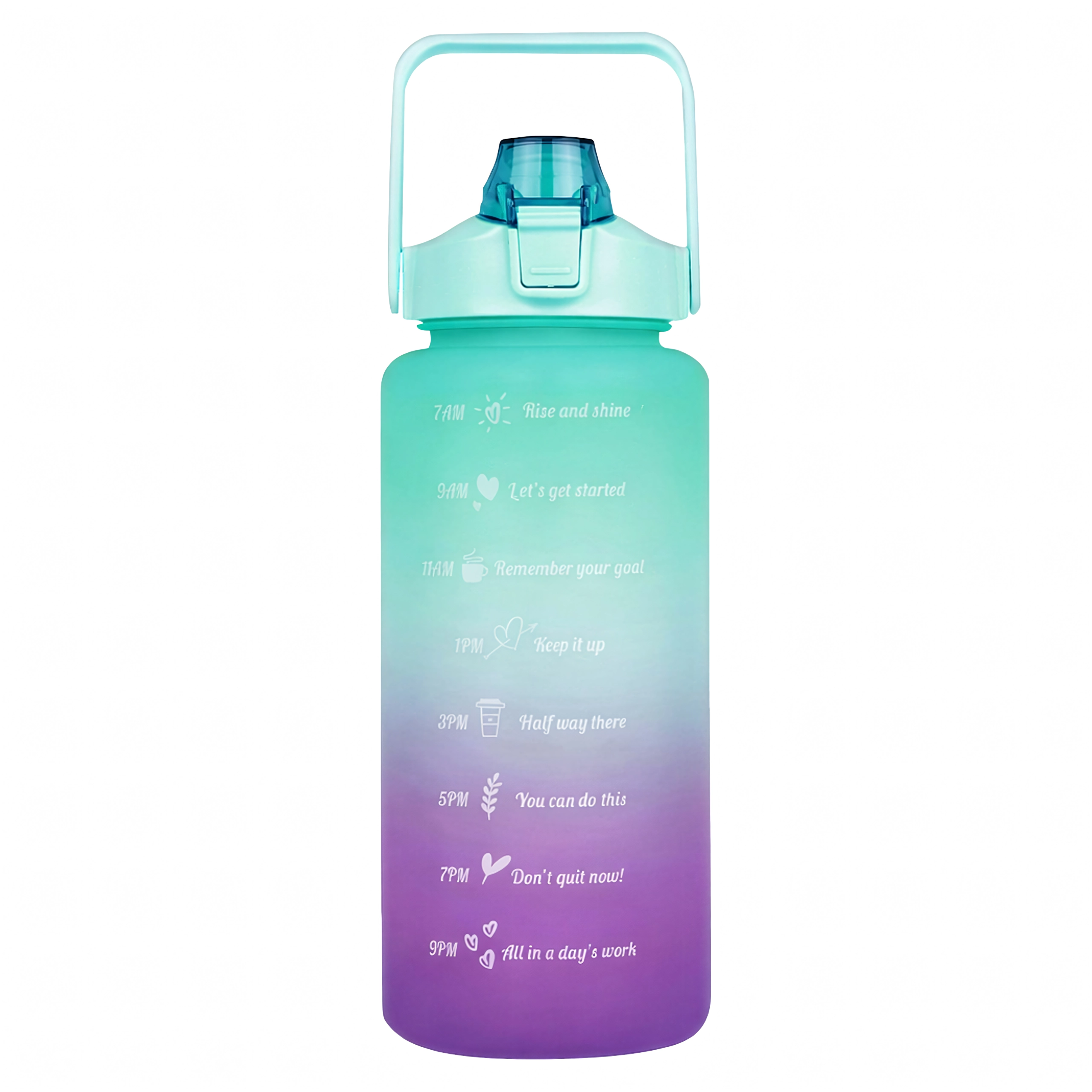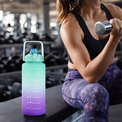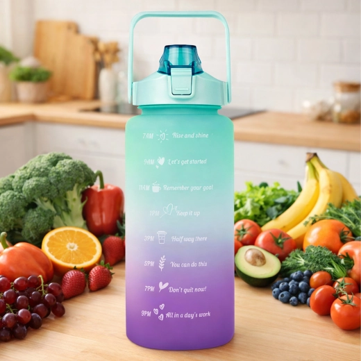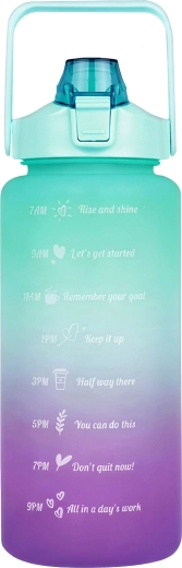 Wielkopojemna motywacyjna butelka na wodę 2 l pomoże w prosty sposób kontrolować dzienne spożycie płynów. Na korpusie butelki znajdziesz czytelne oznaczenia czasowe z motywującymi hasłami, które prowadzą od rana do wieczora. Praktyczna klapka z ustnikiem i słomką zapewnia szybkie picie bez rozlewania, a blokada bezpieczeństwa chroni przed samoczynnym otwarciem w torbie.