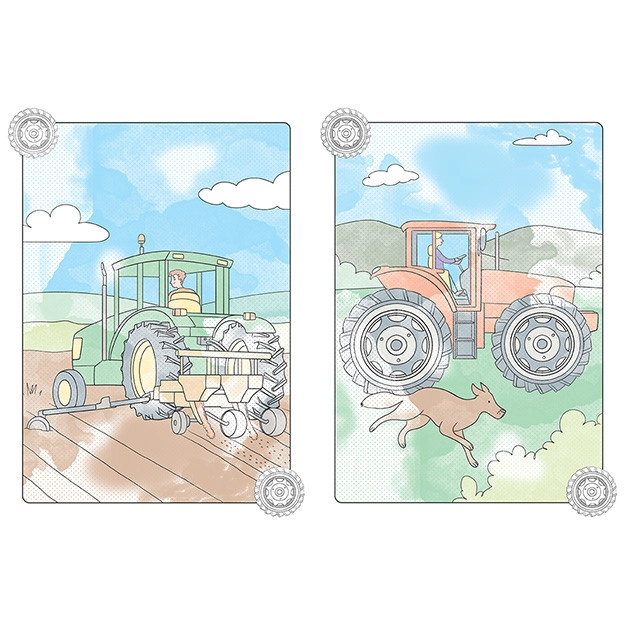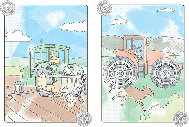 - 8 magicznych ilustracji z motywami traktorów i maszyn rolniczych.