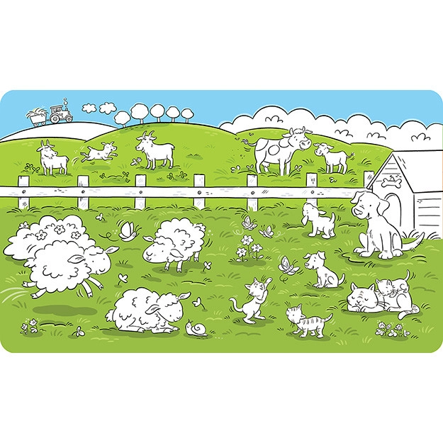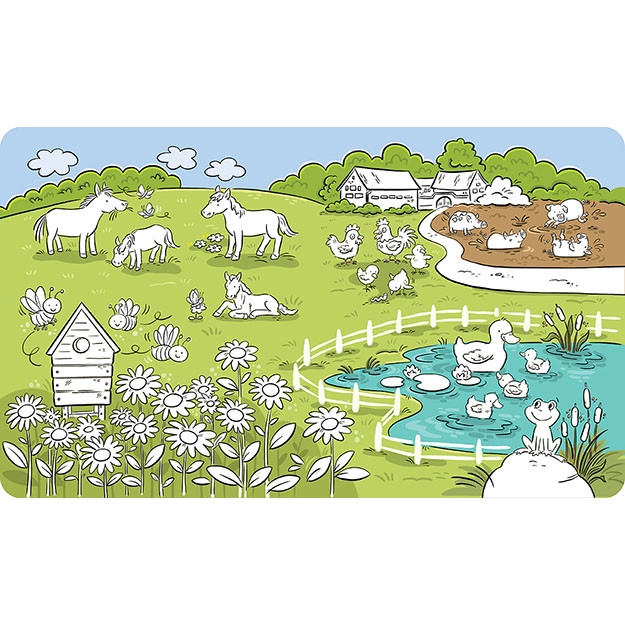 Świetna w domu i w podróży – kompaktowy rozmiar i prosta obsługa wspierają motorykę małą, koordynację ręka–oko oraz kreatywność bez ani kropli farby więcej. Książeczka zawiera 10 pięknie ilustrowanych stron o farmie, które zachwycą dzieci realistycznymi i uroczymi obrazkami zwierząt oraz życia na wsi.