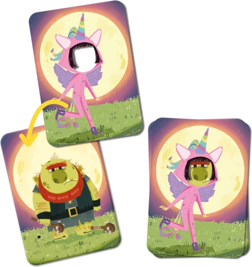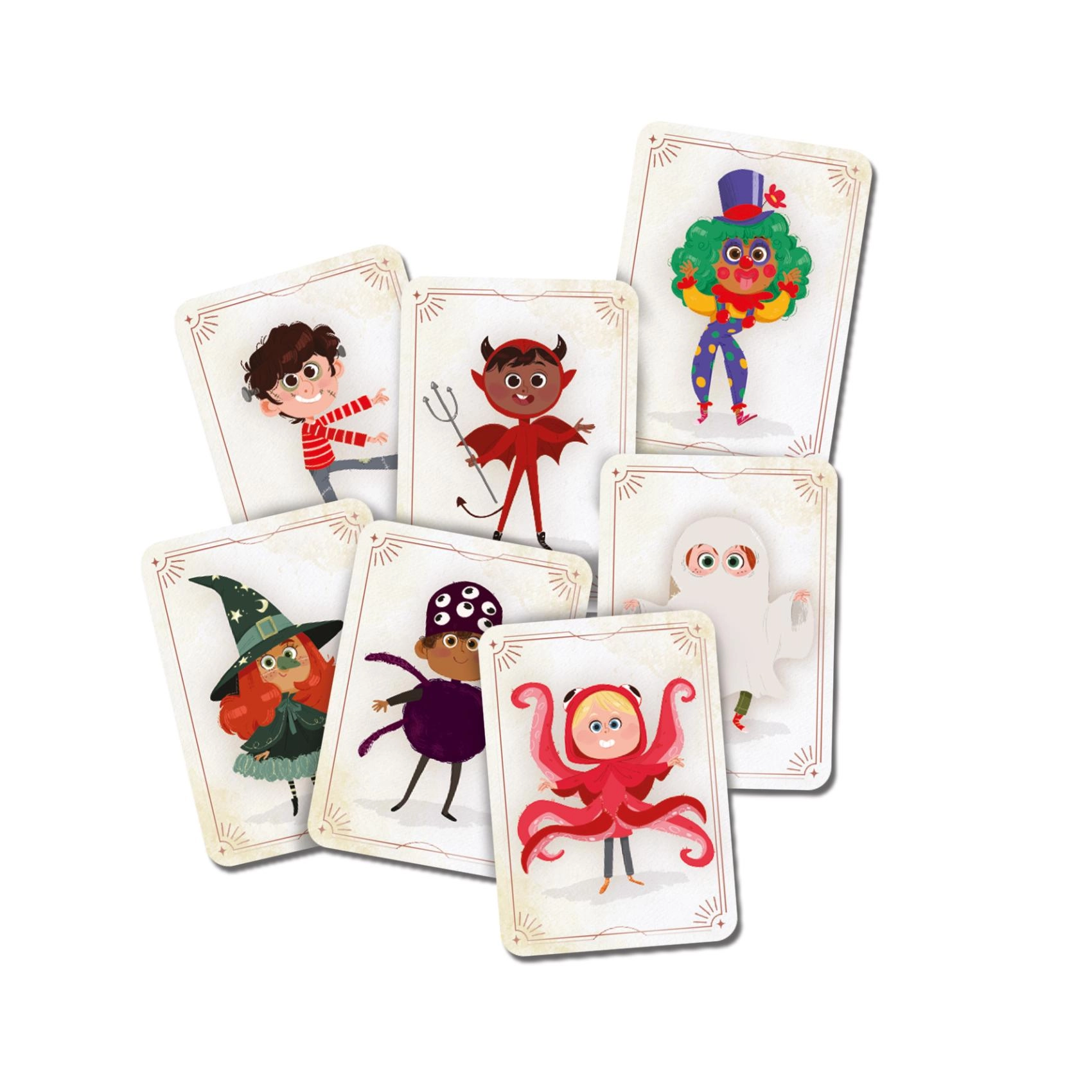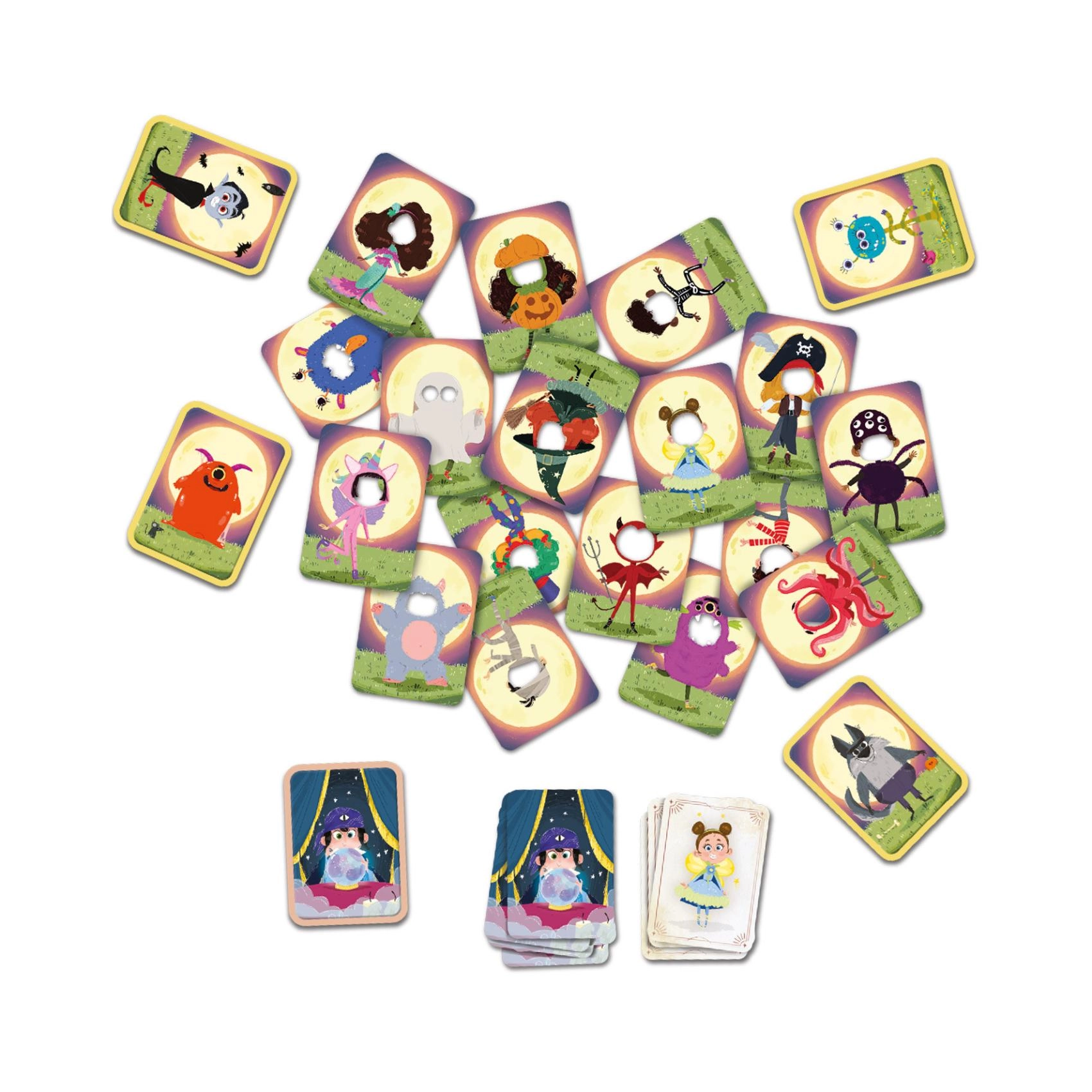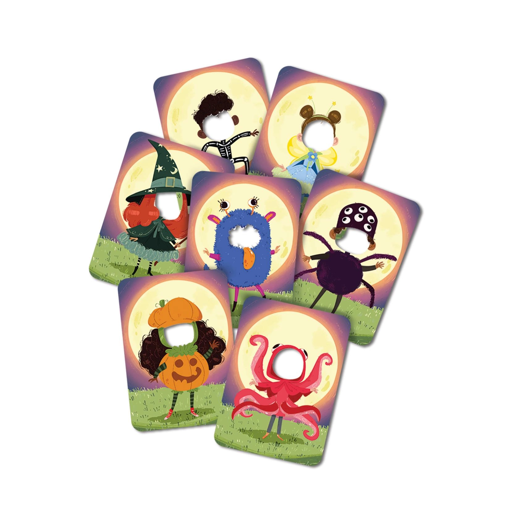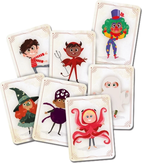 - Wizualnie atrakcyjne karty – kostiumy czarownicy, szkieletu, stworków i innych postaci zachwycą dzieci.