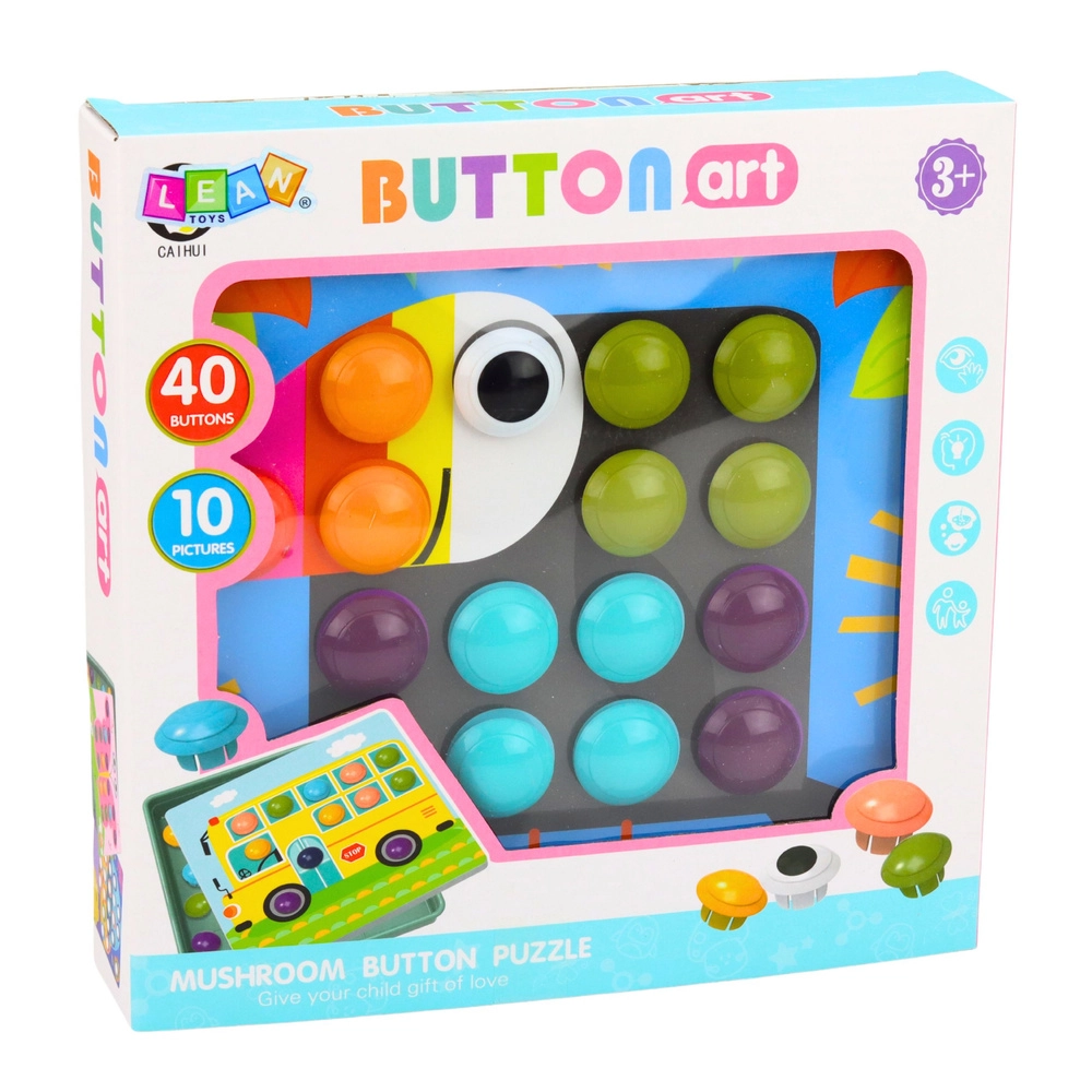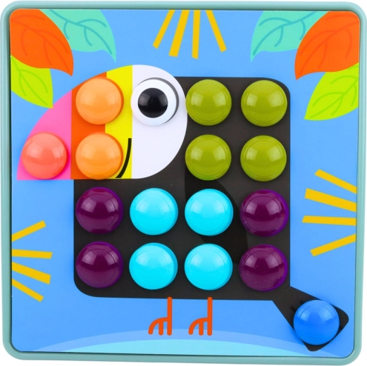 Ta kreatywna mozaika z grzybkami to idealna edukacyjna zabawka dla przedszkolaków. Duże, zaokrąglone guziki łatwo wkłada się w otwory, co wspiera prawidłowy chwyt i wzmacnia motorykę małą. Dzięki żywym kolorom dzieci uczą się sortowania i nazywania barw, jednocześnie trenują koncentrację i cierpliwość.
