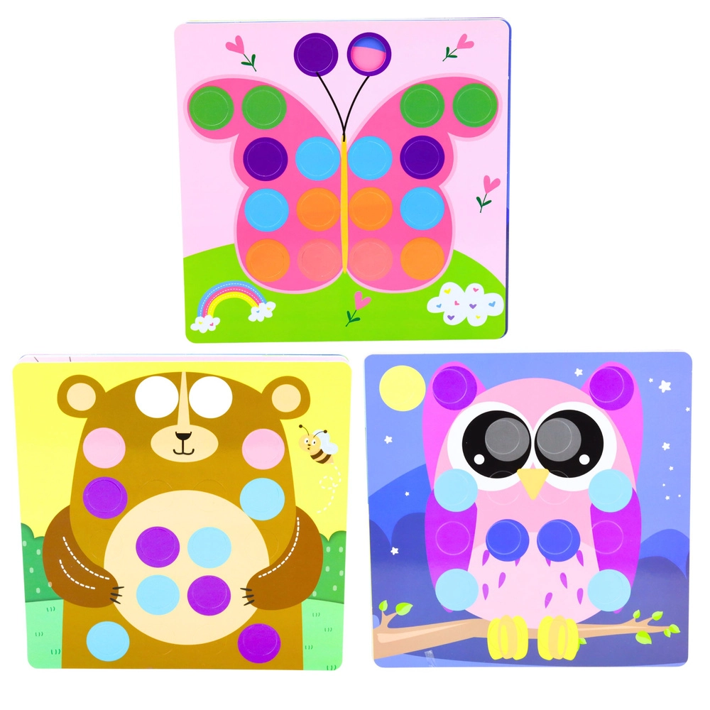 Dzieci wkładają kolorowe guziki w otwory według szablonów i w naturalny sposób uczą się rozróżniania kolorów oraz prostego wzorowania.