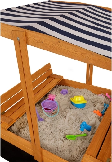 Niebiesko-biały, pasiasty daszek ma regulowaną wysokość i kąt nachylenia, chroni dzieci przed słońcem, a po zakończeniu zabawy zakrywa całą powierzchnię piaskownicy przed deszczem i zabrudzeniami.