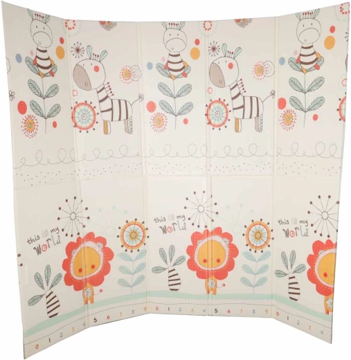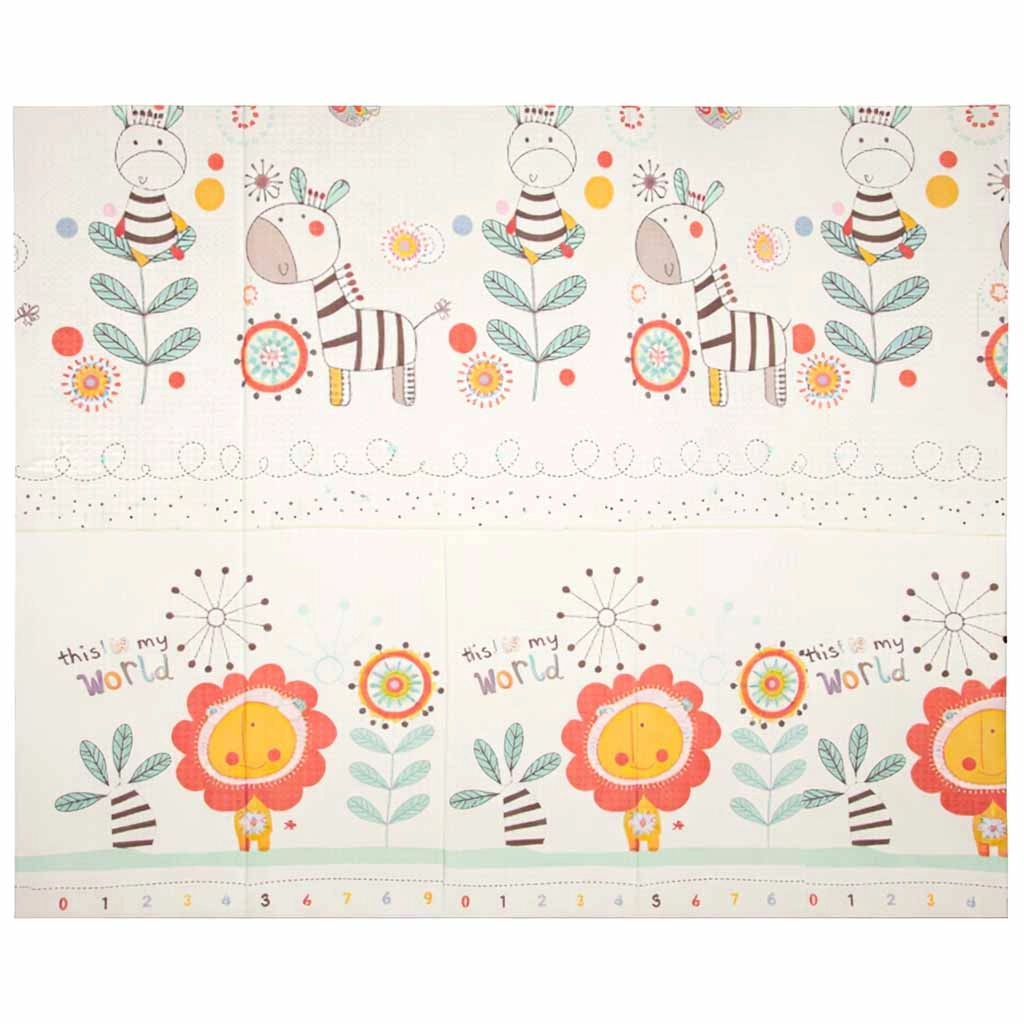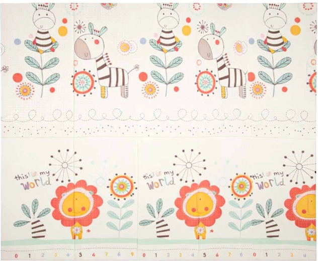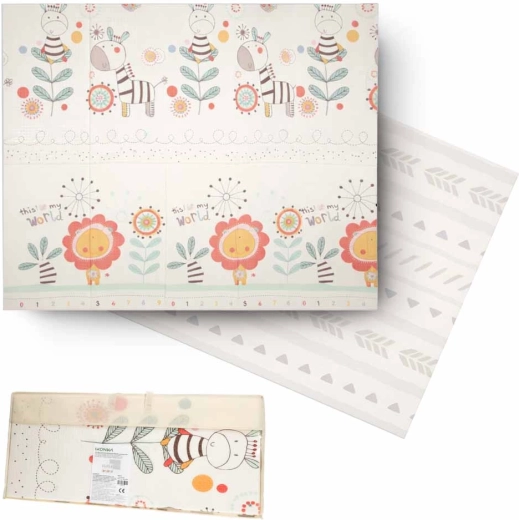Dwustronne wykonanie i składana forma ułatwiają przenoszenie i przechowywanie. Antypoślizgowa i delikatnie teksturowana powierzchnia sprzyja rozwojowi motoryki i wspiera bezpieczny ruch. Materiał XPE jest trwały, antyalergiczny i łatwy w pielęgnacji – wystarczy przetrzeć wilgotną ściereczką.