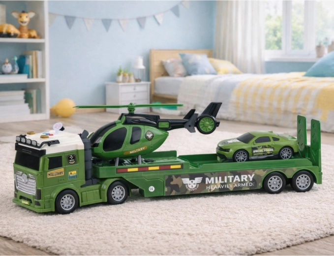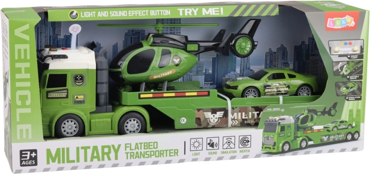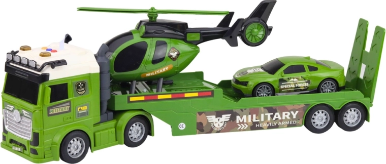 - Zestaw wojskowy: ciężarówka z naczepą, helikopter i wojskowe auto