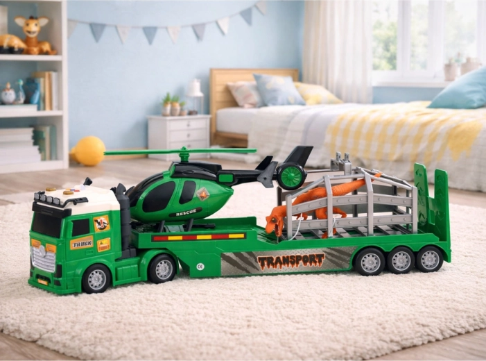 Ten dopracowany zestaw transportowy w zielonym kolorze z nadrukami TRANSPORT i RESCUE jest idealny dla małych miłośników prehistorycznych stworzeń oraz misji ratunkowych. Duży ciągnik z naczepą przewiezie klatkę z dinozaurem oraz helikopter ratunkowy, dzięki czemu dzieci mogą planować akcje ratunkowe, odłowy i specjalne przewozy.