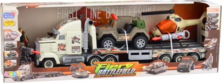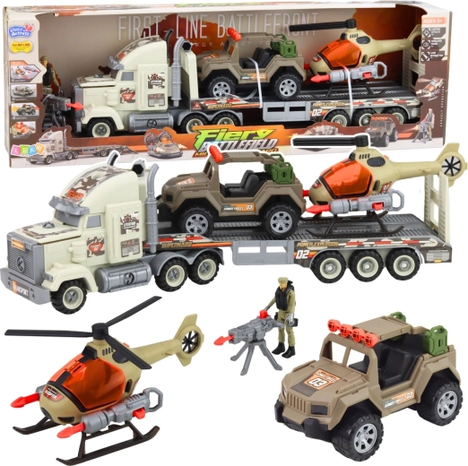 - Kompletny zestaw: ciągnik z naczepą, helikopter, auto terenowe, figurka żołnierza