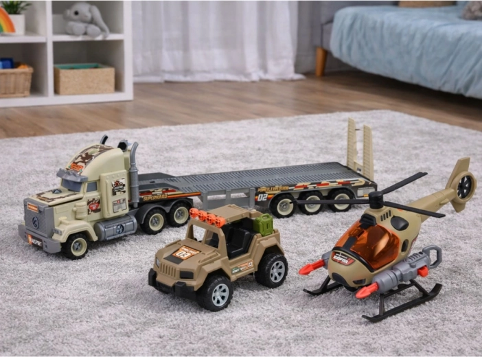 Rozbudowany wojskowy zestaw do kreatywnej zabawy obejmuje duży ciągnik transportowy z naczepą, helikopter, auto terenowe oraz figurkę żołnierza. Dzieci mogą tworzyć realistyczne misje i konwoje, przenosić sprzęt i ćwiczyć akcje ratunkowe. Helikopter oferuje efekty świetlne i dźwiękowe, pojazdy mają koła na swobodnym biegu i solidne wykonanie w stylu militarnym.