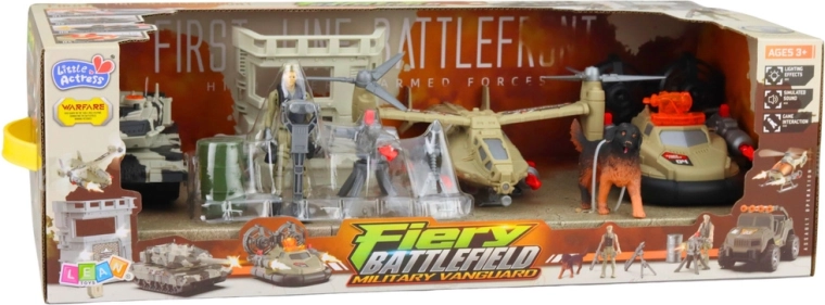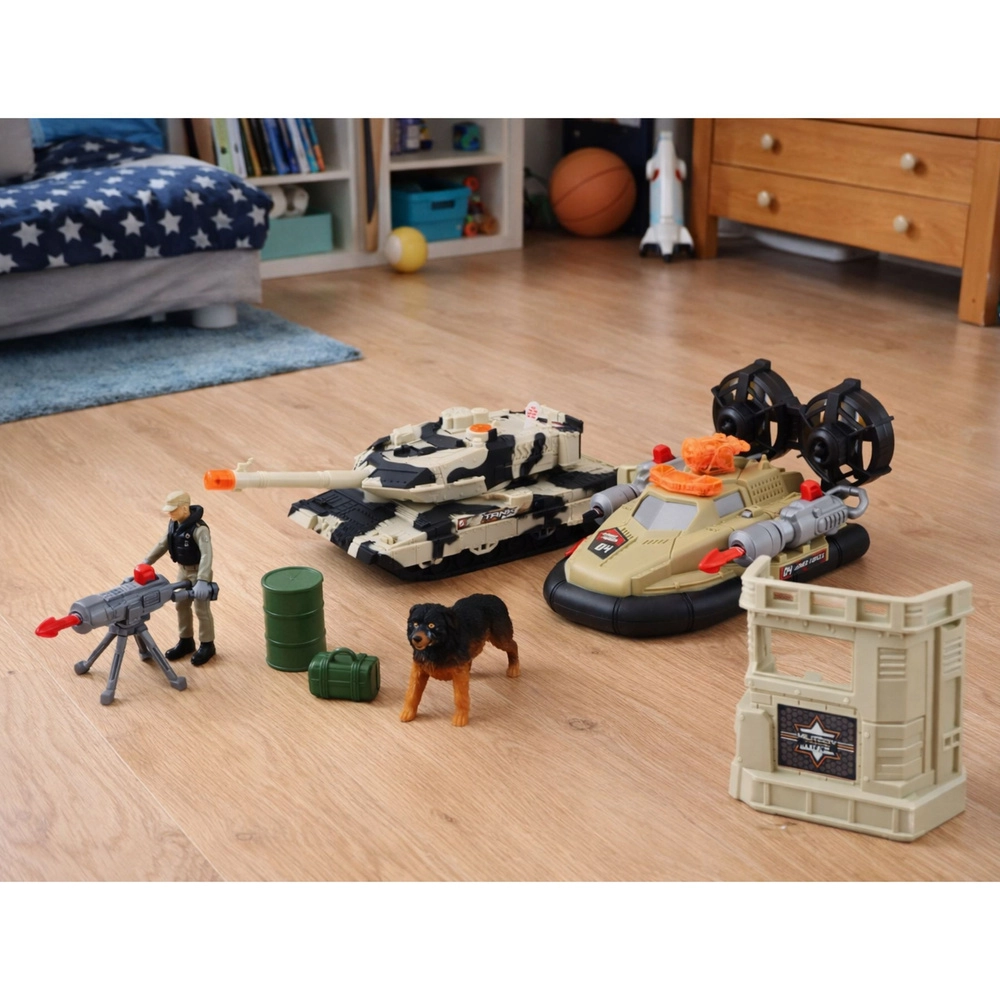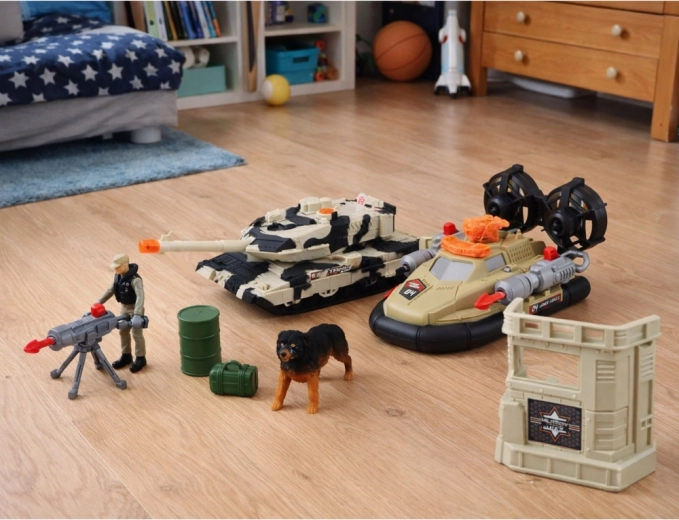 - Czołg, helikopter, poduszkowiec, wojskowa baza, figurki, pies, dodatki