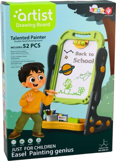 Kreatywna, dwustronna magnetyczna tablica dla dzieci łączy stronę kredową i suchościeralną z funkcją magnetyczną. Stabilny stojak, wygodne przenoszenie oraz atrakcyjne zielone wykończenie wspierają naukę przez zabawę, pisanie, rysowanie i układanie magnesów. Bogaty zestaw 52 elementów dostarcza wiele zabawy i edukacji.