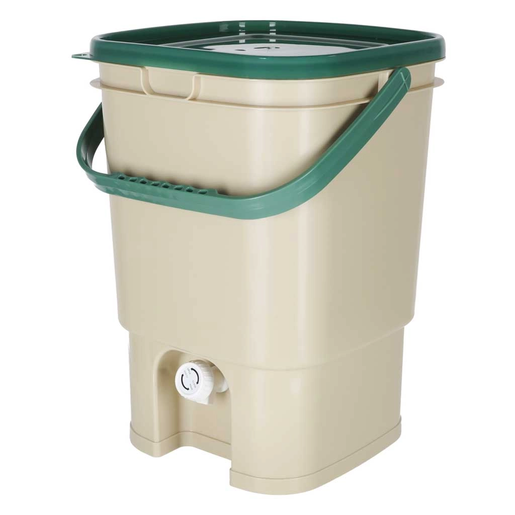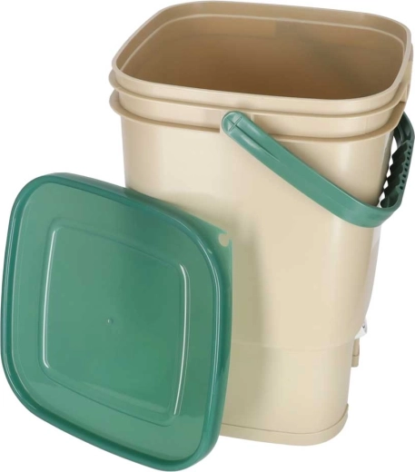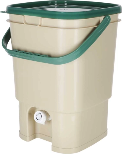 Praktyczny kompostownik do mieszkania i domu pozwala higienicznie gromadzić organiczne resztki (skórki, fusy po kawie, torebki herbaty, skorupki jaj itp.) w jednym miejscu. Solidna pokrywa ogranicza rozchodzenie się zapachów, wewnętrzna perforowana wkładka oddziela materiał stały od cieczy, a dolny kranik ułatwia spuszczanie bogatego w składniki odżywcze wyciągu.