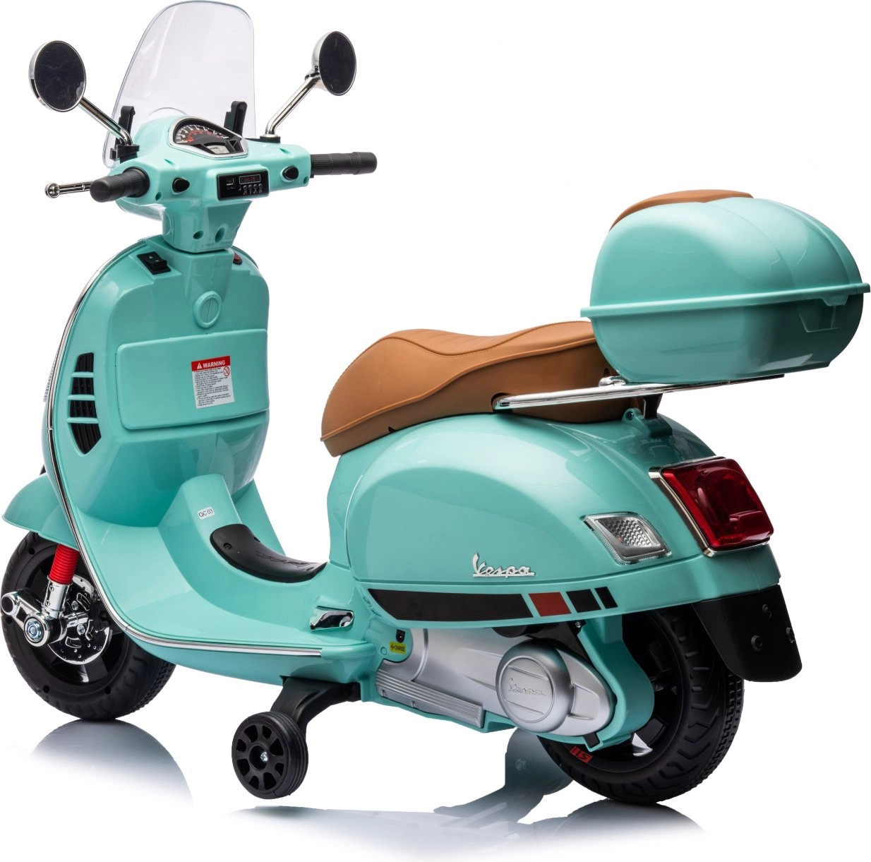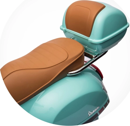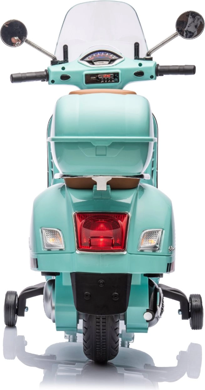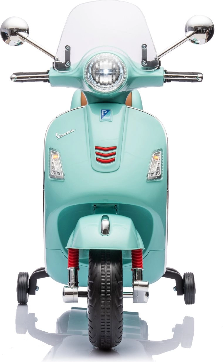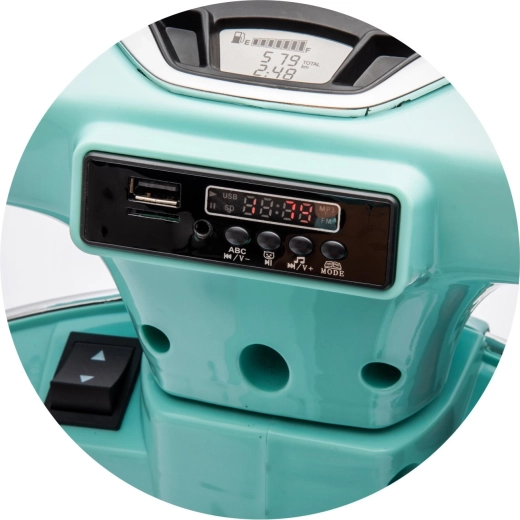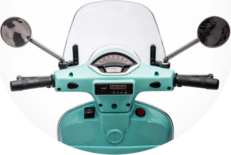 Stylowy dziecięcy elektryczny motocykl inspirowany kultową VESPA GTS zachwyci małych kierowców realistycznym wyglądem i bezpieczną jazdą. Oferuje dwa silniki 2 × 30 W, kółka stabilizujące, oświetlenie LED, wygodne siedzenie z eko skóry oraz panel muzyczny z USB/TF/MP3/AUX. W zestawie znajduje się także tylny schowek oraz efekty świetlne i dźwiękowe dla jeszcze większej frajdy.