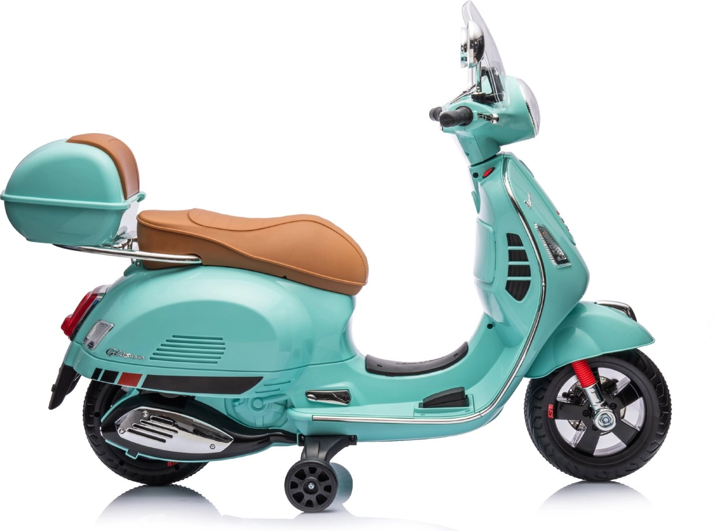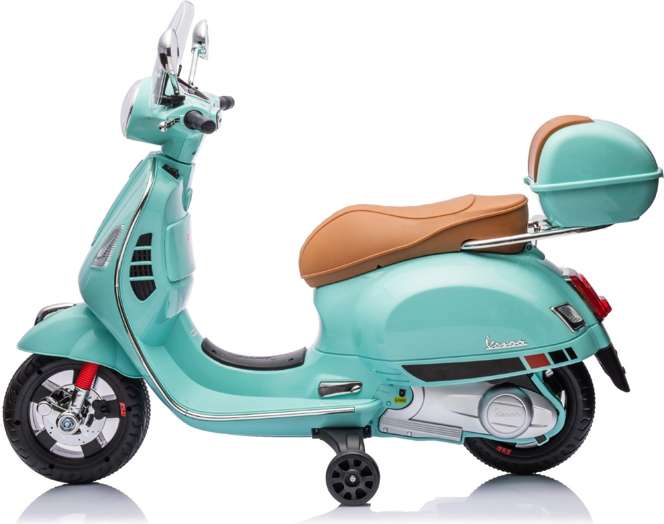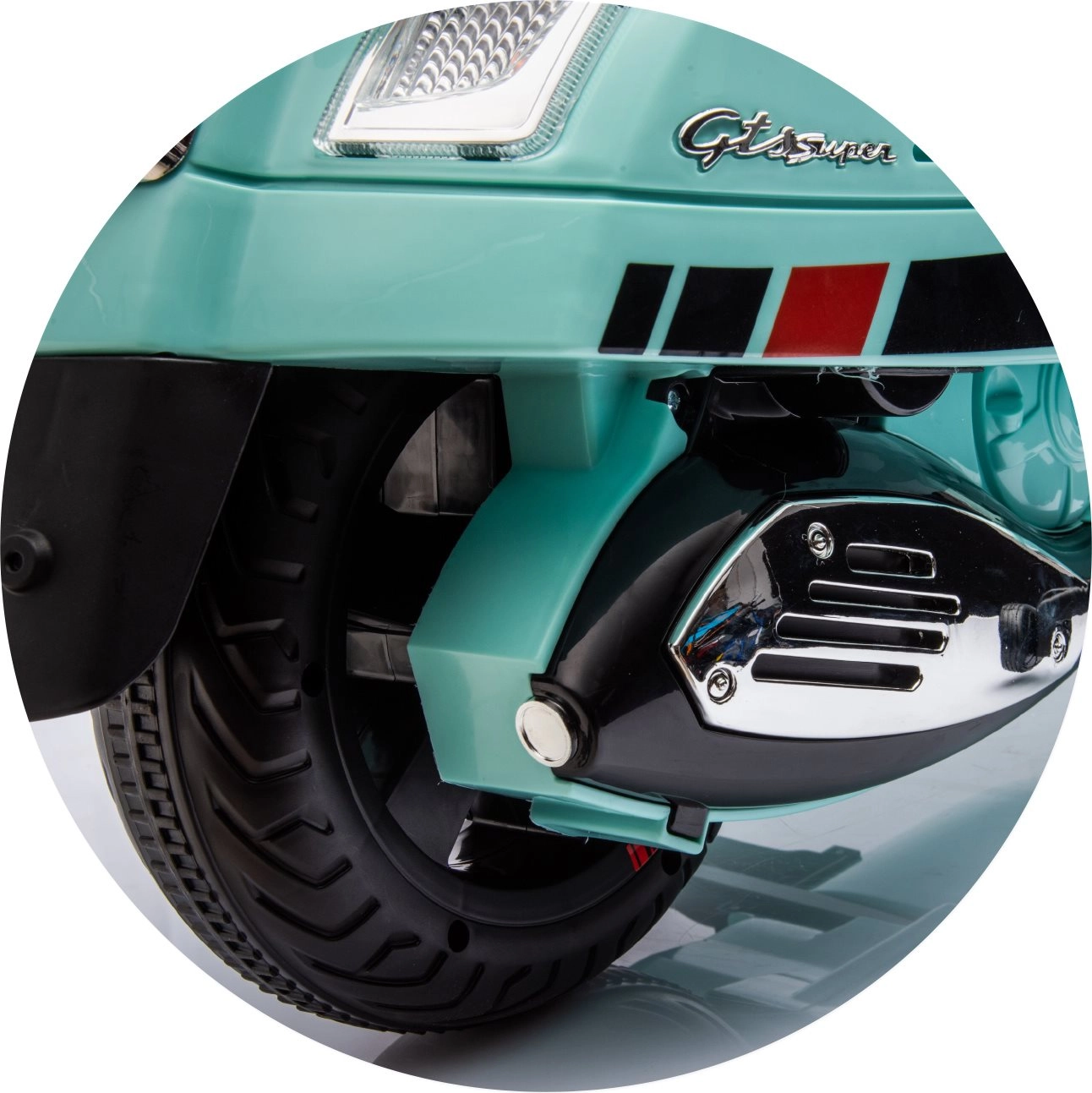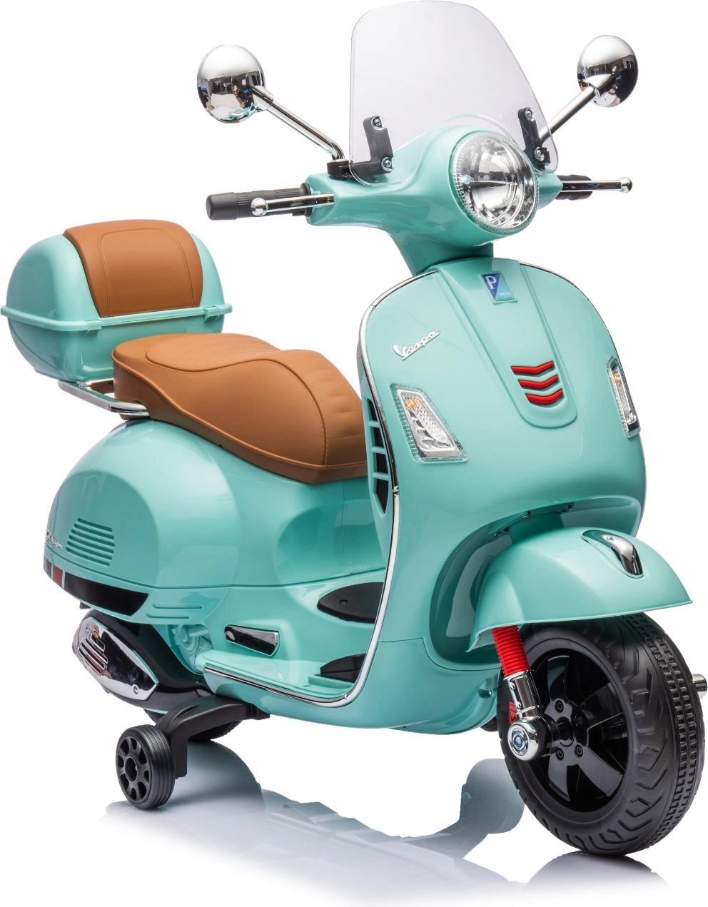 Stylowy dziecięcy elektryczny motocykl inspirowany kultową VESPA GTS zachwyci małych kierowców realistycznym wyglądem i bezpieczną jazdą. Oferuje dwa silniki 2 × 30 W, kółka stabilizujące, oświetlenie LED, wygodne siedzenie z eko skóry oraz panel muzyczny z USB/TF/MP3/AUX. W zestawie znajduje się także tylny schowek oraz efekty świetlne i dźwiękowe dla jeszcze większej frajdy.