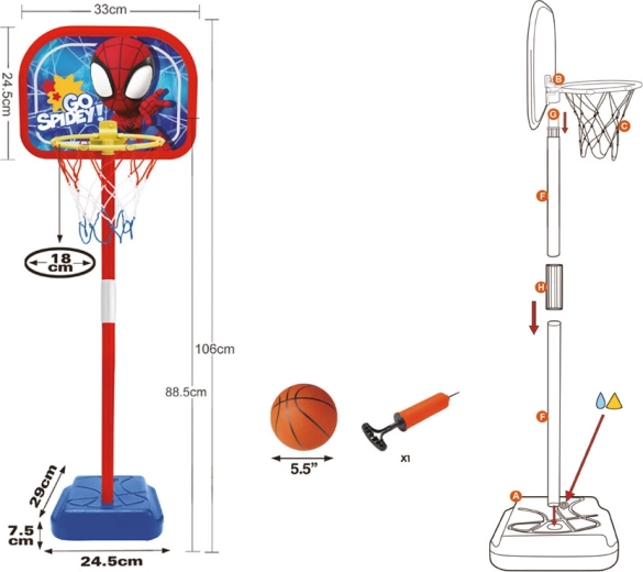 Dziecięcy koszykarski zestaw z motywem SPIDEY zapewnia zabawę w domu i w ogrodzie. Regulowana wysokość kosza rośnie razem z dzieckiem, stabilna podstawa gwarantuje bezpieczną grę, a dzięki piłce (Ø 14 cm) i pompce w zestawie możesz zacząć grać od razu po rozpakowaniu.