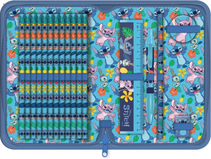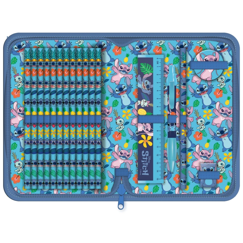 Ten wypełniony piórnik z uroczym motywem Stitcha z filmu Lilo i Stitch zachwyca wyrazistym niebieskim designem i tropikalnymi elementami, takimi jak kwiaty i liście. Przód zdobi ikoniczny Stitch, a wewnątrz znajduje się zabawny nadruk z postaciami i kolorowymi motywami, które nadają piórnikowi radosny charakter.