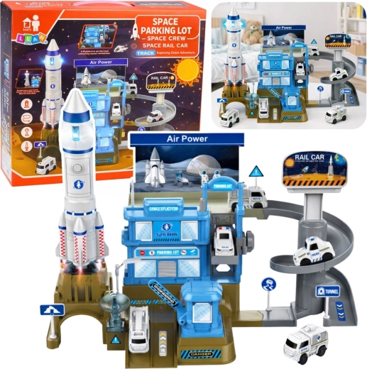 - Stacja kosmiczna z rakietą i wielopoziomowym parkingiem