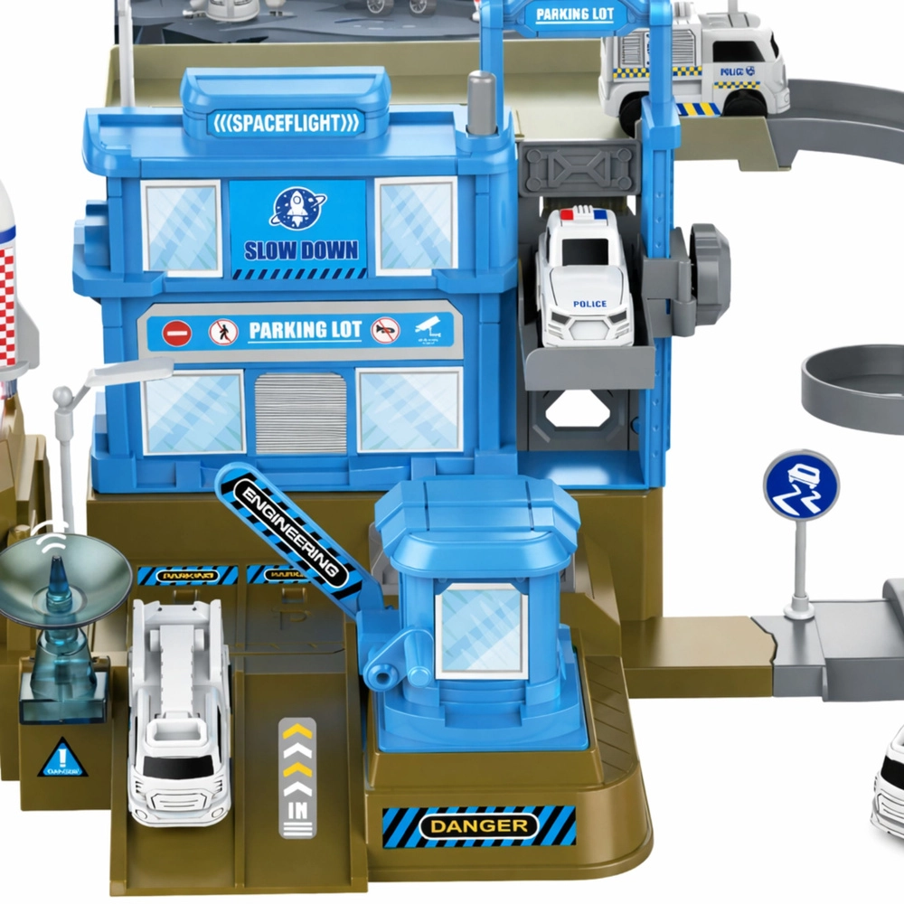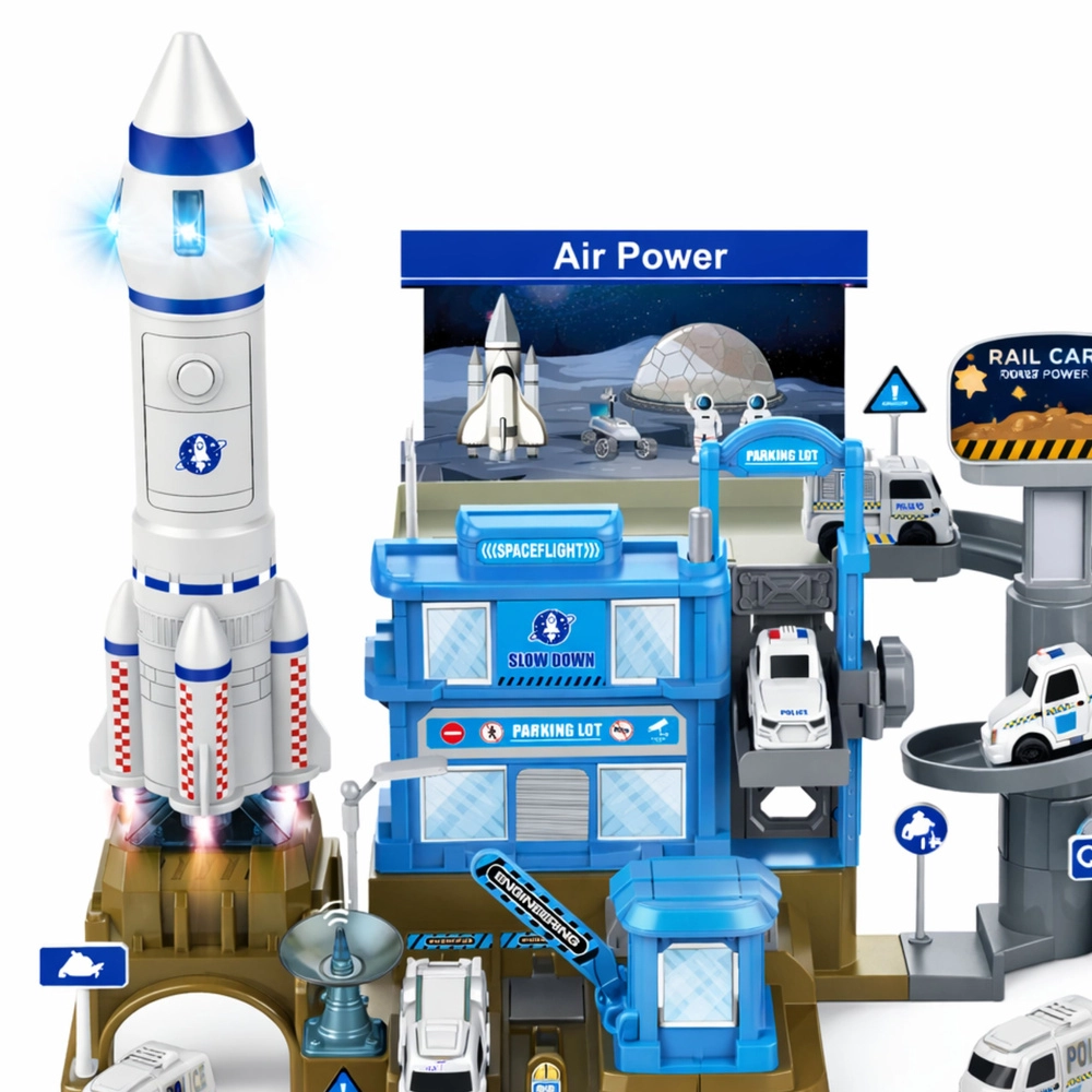Ta dopracowana baza kosmiczna z rakietą przenosi dzieci w świat fantazji, misji i odkryć. Wielopoziomowa konstrukcja ze spiralną drogą, parkingiem, systemem wind oraz startem rakiety pobudza kreatywne scenariusze i płynną zabawę.