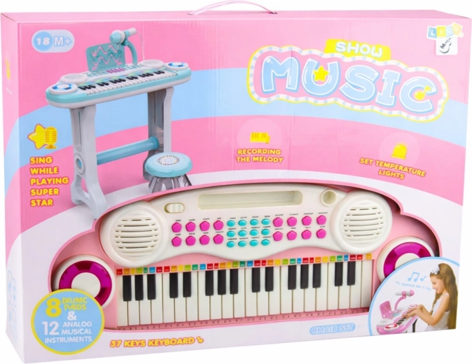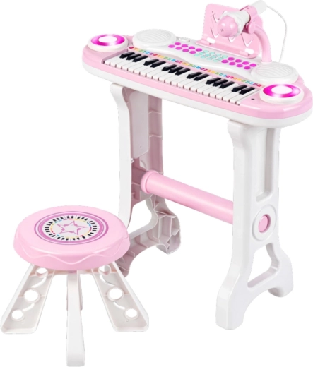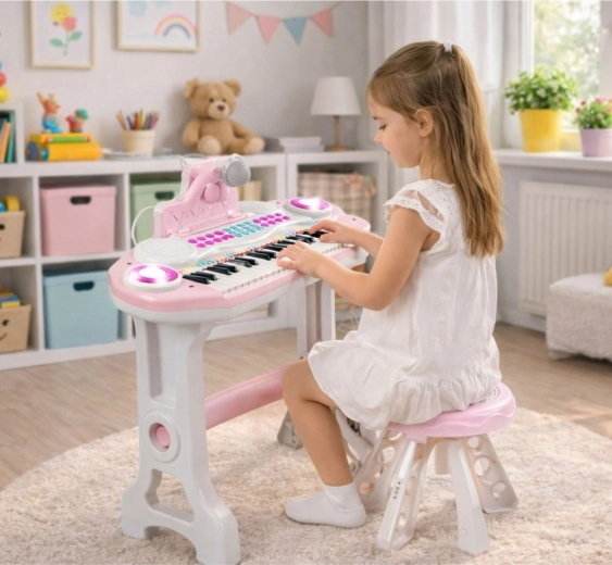 Rozwijaj muzyczny talent swojego dziecka z różowymi elektronicznymi klawiszami z 37 klawiszami, mikrofonem i funkcją MP3. Oferują zabawne rytmy, różne instrumenty, nagrywanie i odtwarzanie, regulację tempa i głośności oraz świetlne efekty LED. W zestawie znajdują się stolik, taboret i pulpit na nuty dla wygodnej gry.