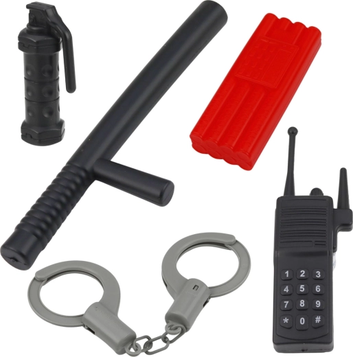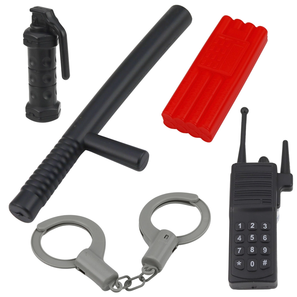 W zestawie znajdują się realistyczne akcesoria z wytrzymałego plastiku: pistolet-zabawka, kajdanki, krótkofalówka, pałka, znak STOP oraz gogle/maska ochronna. Dzieci w bezpieczny sposób poćwiczą pracę zespołową, komunikację i zasady ruchu drogowego.