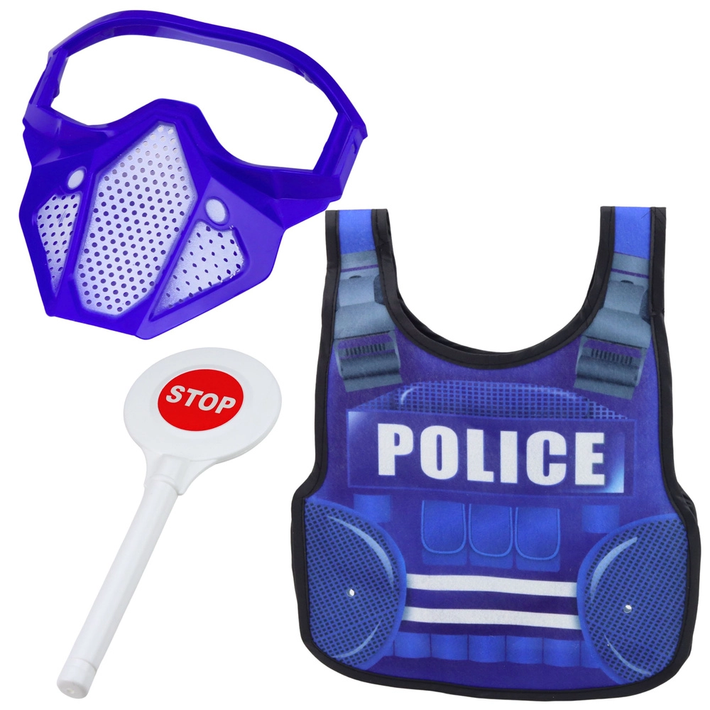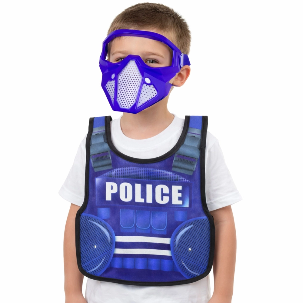 Kompletny dziecięcy policyjny zestaw dla małych stróżów prawa. Zawiera lekką kamizelkę z napisem POLICE, pistolet zabawkowy, kajdanki, krótkofalówkę, pałkę, znak STOP oraz gogle/maskę ochronną. Idealny do kreatywnej zabawy w odgrywanie ról, rozwijania wyobraźni i bezpiecznej, dynamicznej rozrywki w domu i na zewnątrz.