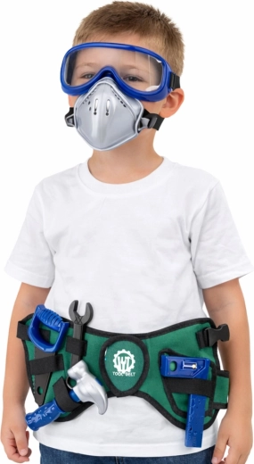 W zestawie znajdują się gogle i maska ochronna; pas utrzymuje podstawowe narzędzia zawsze pod ręką i wspiera bezpieczne nawyki podczas zabawy.