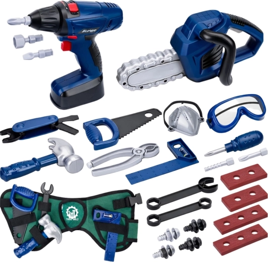 Praktyczny dziecięcy zestaw narzędzi w przenośnej szafce oferuje aż 30 elementów do realistycznej zabawy w majsterkowicza. Znajdziesz w nim wkrętarkę akumulatorową, młotek, piłę, klucze, wkrętak, szczypce, elementy montażowe oraz gogle i maskę ochronną. Lekki i wytrzymały plastik zapewnia bezpieczne i wygodne użytkowanie, a szafka z uchwytem ułatwia przechowywanie i przenoszenie.