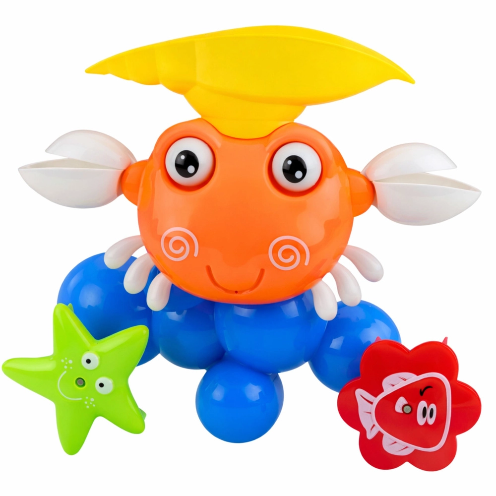 Kolorowy krab z uśmiechem i fontanną zamieni wannę w morski świat. Wystarczy wlać wodę do górnej muszli, a kółeczka się rozkręcą, elementy się poruszą i z pyszczka kraba wytryśnie drobna fontanna. Dzięki przyssawkom zabawkę łatwo przymocujesz do gładkich płytek lub wanny, gdzie stabilnie trzyma się przez całą zabawę.
