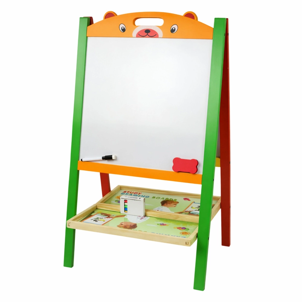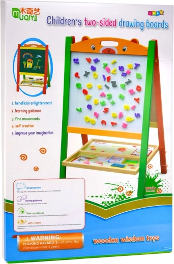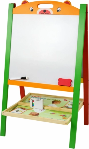 Solidna rama z naturalnego drewna jest stabilna i bezpieczna, bez ostrych krawędzi. Składany stojak oszczędza miejsce podczas przechowywania. W zestawie znajduje się wszystko, co potrzebne do natychmiastowego użycia – magnesy, mazak suchościeralny z gumką, kreda i gąbka.