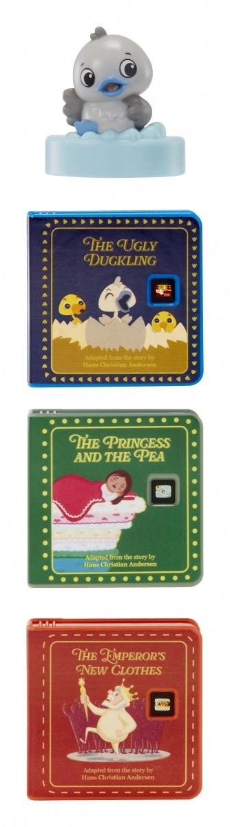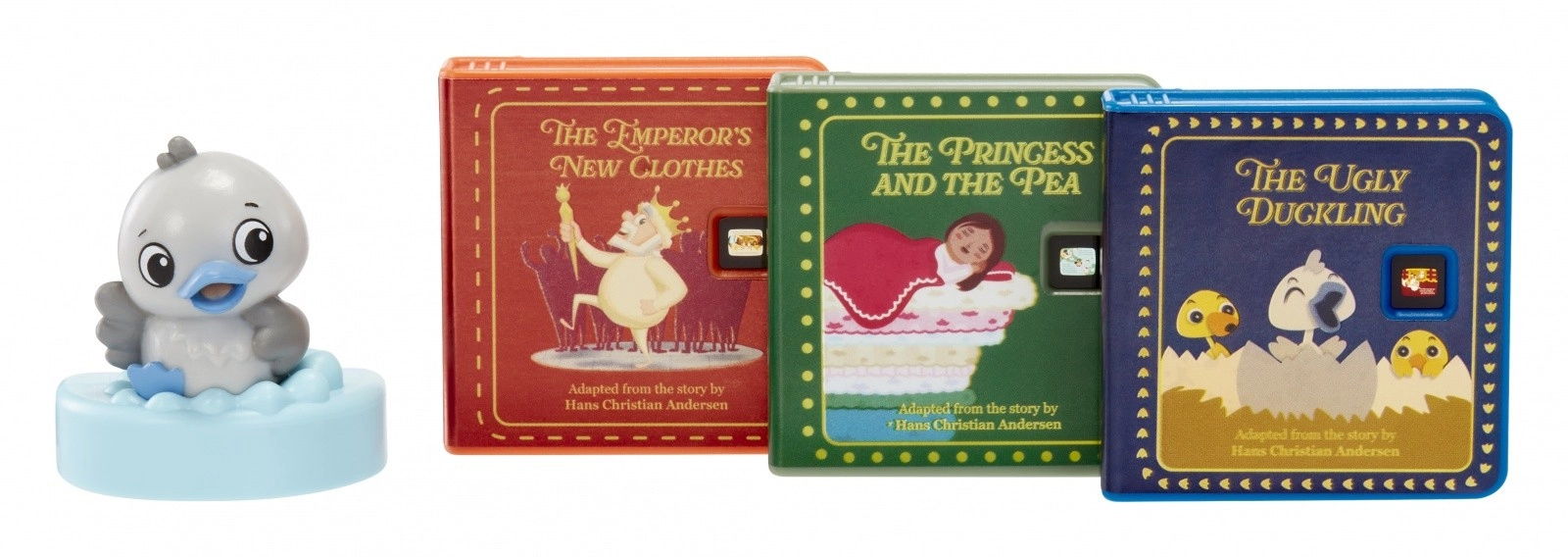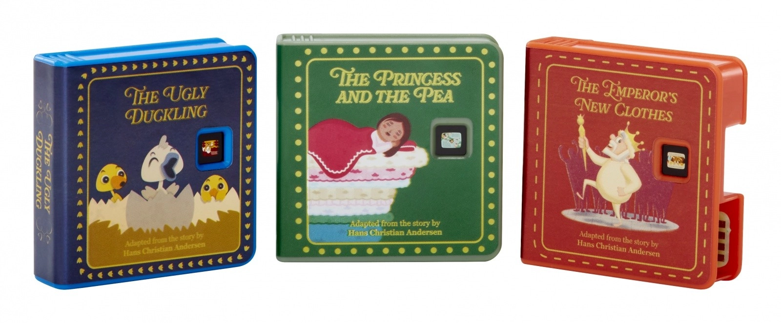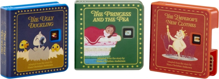 Boczne kieszenie utrzymują kartridże z opowieściami zawsze pod ręką. Dostępna jest rozszerzalna kolekcja tytułów, które można dokupować zgodnie z zainteresowaniami dzieci.